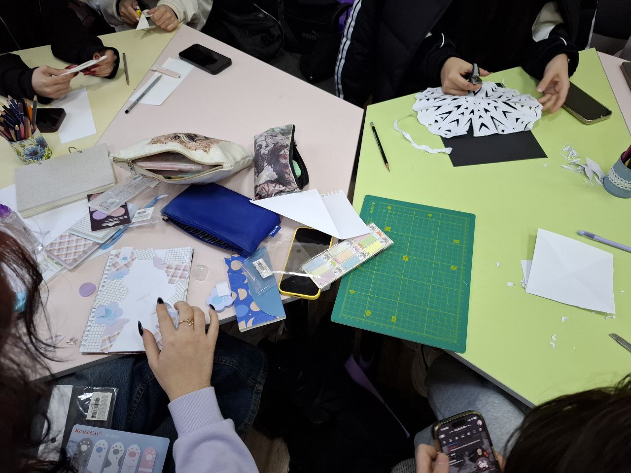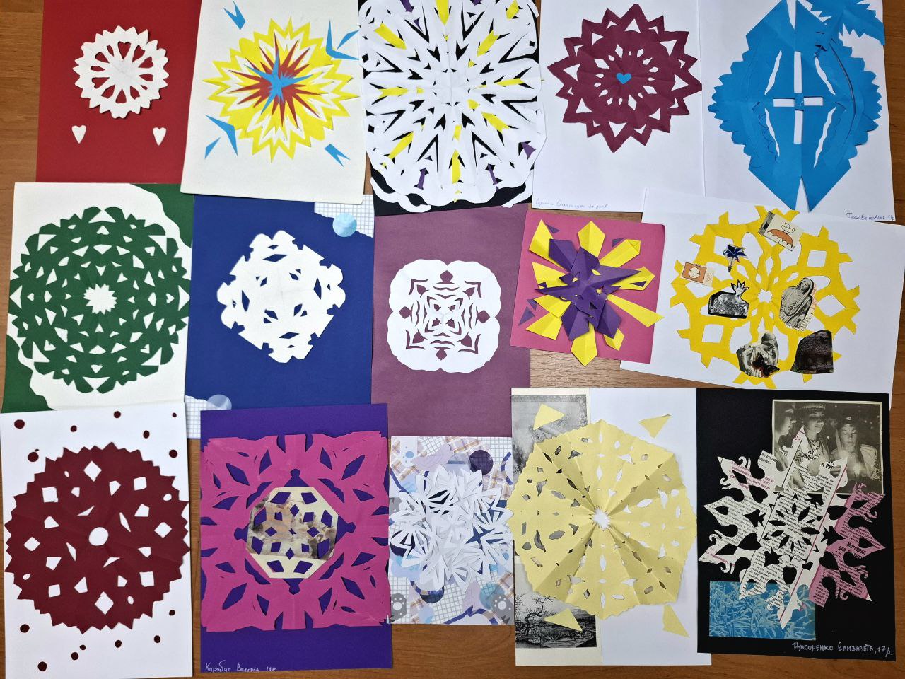 This stage served as the psychological foundation for the transition to the central part of the lesson – the creation of the “Snowflake of Personal Meaning” collage. From a psychological perspective, a snowflake is a powerful archetypal symbol that combines geometric order and natural chaos. In the context of art therapy, this image allows for the processing of the concepts of uniqueness and self-worth: every snowflake is symmetrical, yet its pattern never repeats, which is identical to the human experience, where each of us is part of the general structure of the world while remaining unique in our experiences. Participants created their own eight-pointed snowflakes, in which each line represented a distinct life sphere or a complex emotional state experienced during the year. The choice of textures, colour palettes, and shapes allowed for the externalisation of internal memories, turning them into aesthetic objects – crystals of memory that hold the depth and value of the path travelled.