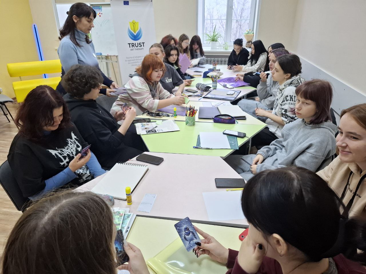 The art therapy began with an insight session using Metaphorical Associative Cards (MAC), a widely used method in art therapy for projective diagnosis and correction. The use of cards allowed participants to gently bypass the rational filters of consciousness and enter a direct dialogue with their own subconscious. The primary vector of this work was the search for balance between two fundamental psychological poles: external support and internal resilience. Under conditions of chronic instability and external pressure, these categories become decisive in maintaining the integrity of the personality. Each card revealed individual layers of meaning, transforming into metaphorical images – some identified support through the symbol of an outstretched hand, some built an imaginary bridge to their own “self”, while for others, the key image was that of strong roots providing stability even under a storm of radical changes. This prelude allowed for the formation of a therapeutic safe space, where the verbalisation of hidden fears and doubts was transformed into the identification of real sources of support – ranging from external social connections to deep internal resources, such as faith and creative energy.