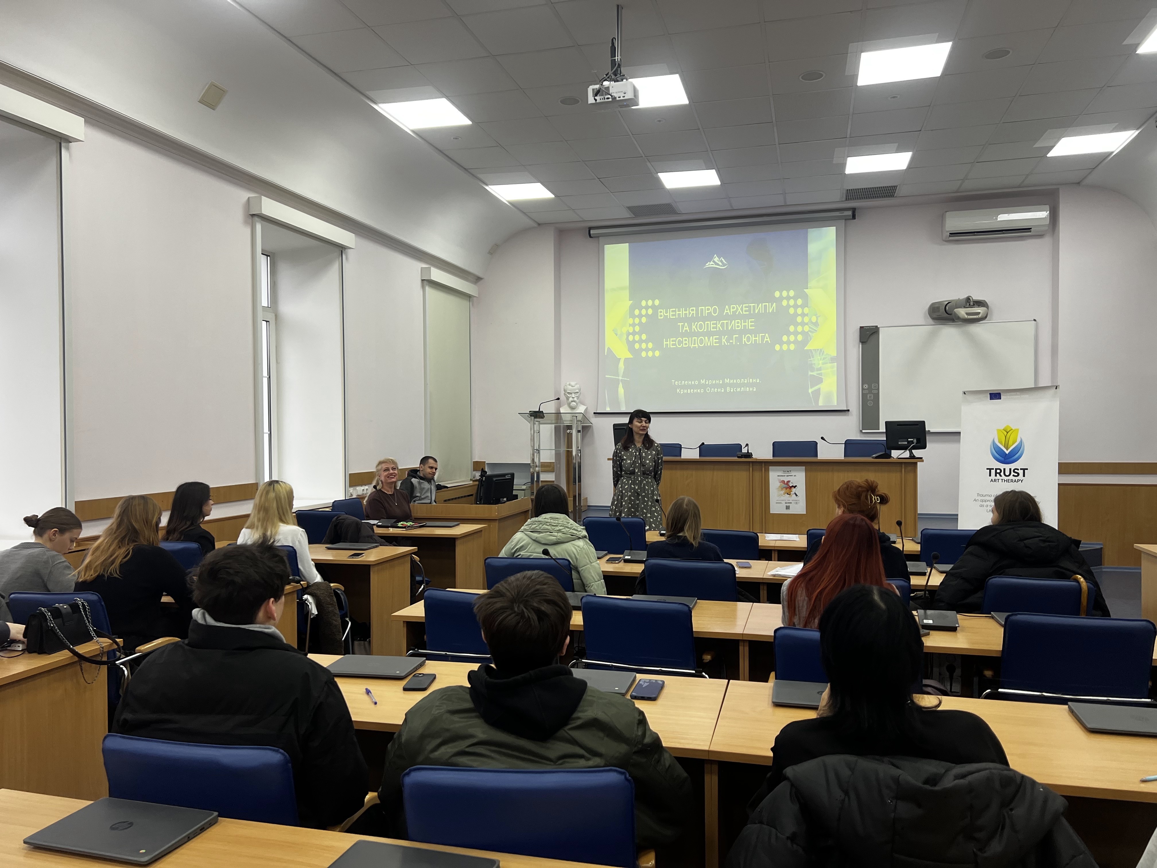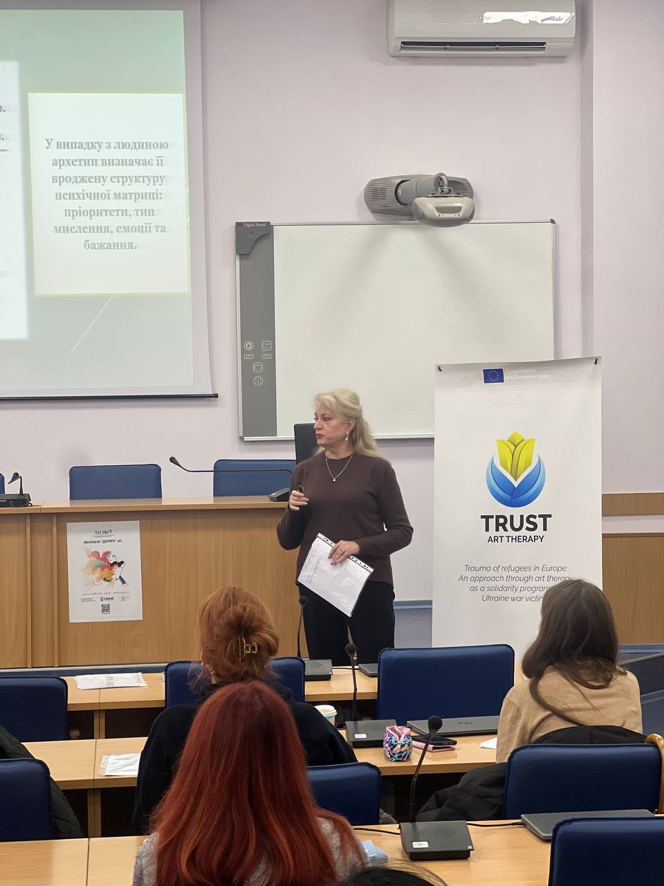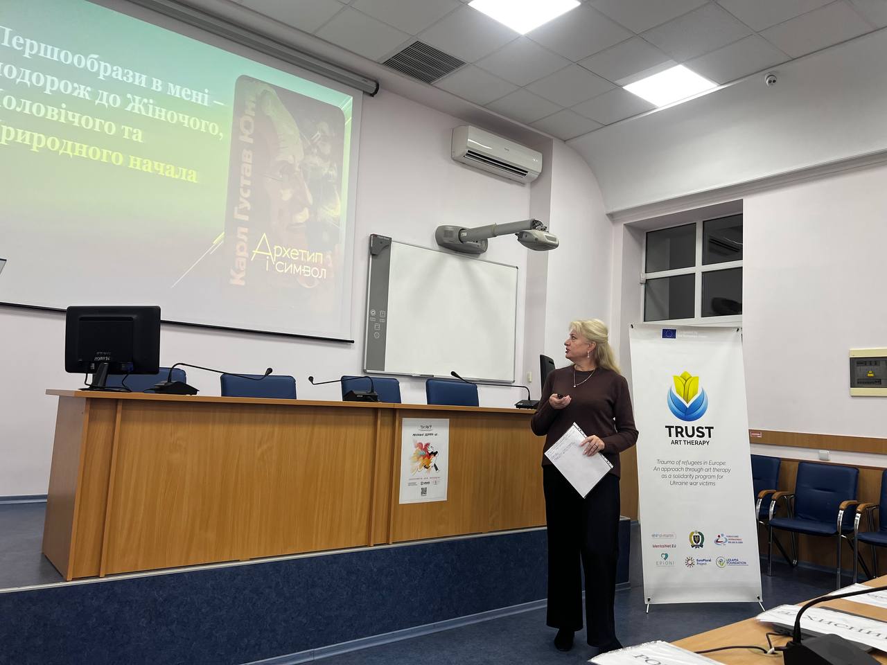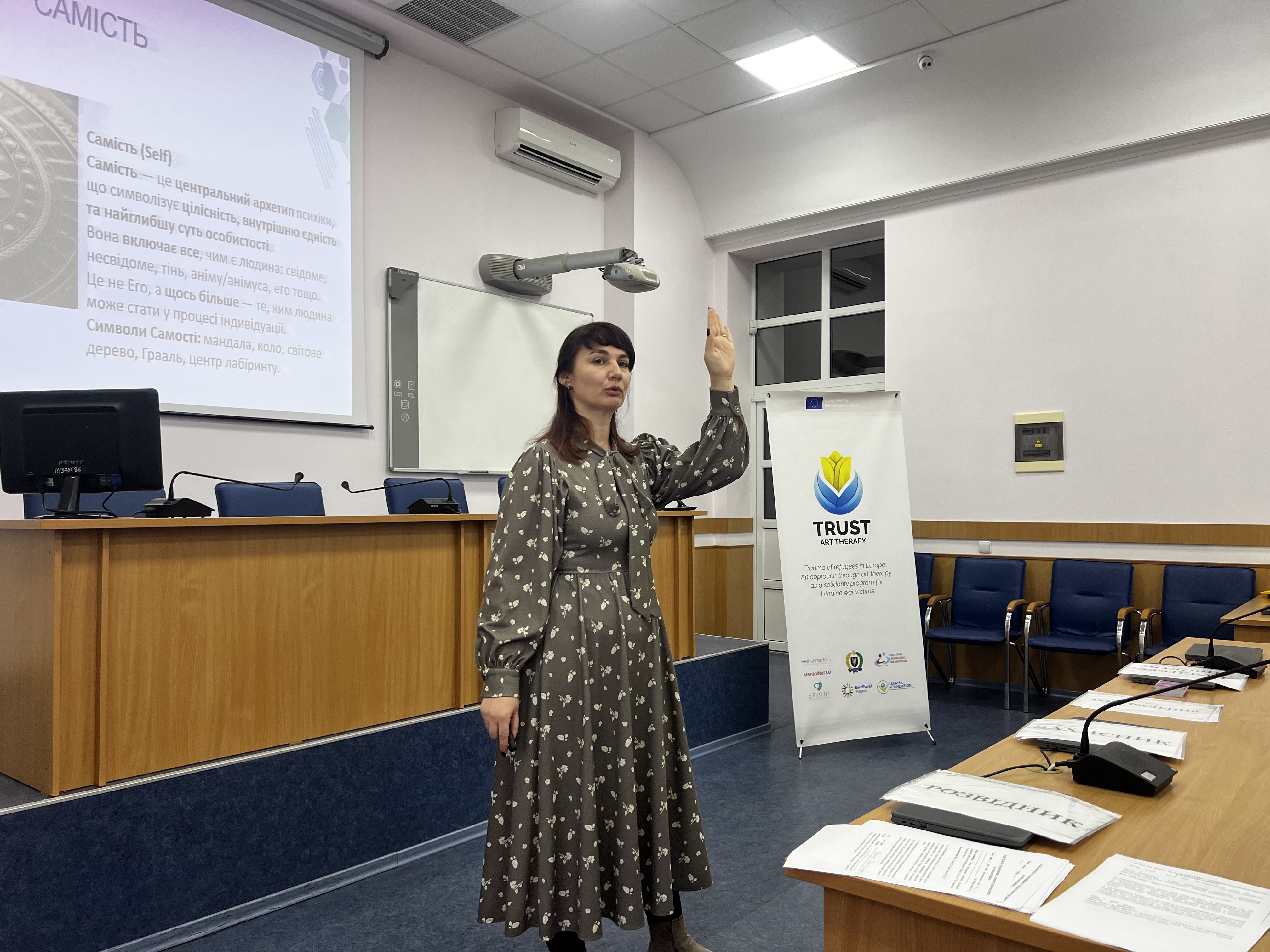 On October 27, 2025, within the walls of Poltava Polytechnic, an art therapeutic meeting took place titled “Primal Images Within Me – A Journey to the Feminine, Masculine, and Natural Principle”, conducted under the leadership of Candidate of Pedagogical Sciences, Associate Professor of the Department of Psychology and Pedagogy Maryna Teslenko and practical psychologist Olena Kryvenko, and aimed at restoring mental health through work with deep structures of the psyche. In conditions of prolonged stress caused by war, habitual cognitive mechanisms often prove insufficient for processing traumatic experience; therefore, the facilitators focused on methods of depth psychology and art therapy, which allow one to bypass psychological defences and work directly with unconscious material gently.