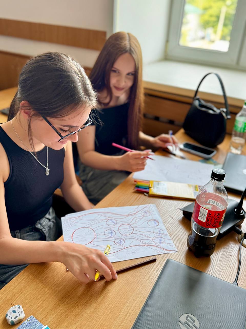 The next step was an introduction to the technique of neurography. The psychologist briefly but clearly explained the basic principles of this method: the use of flowing lines, rounding of corners, building compositions through circles, and working with colour and field lines. These foundational concepts became the basis for the subsequent art practice.