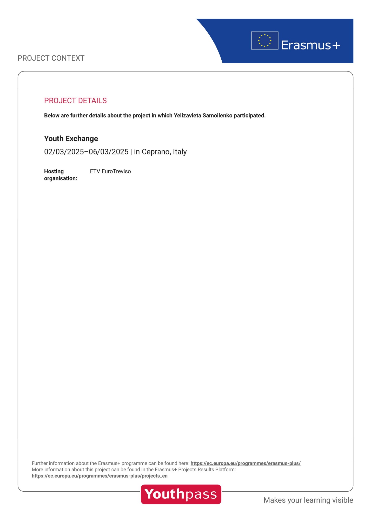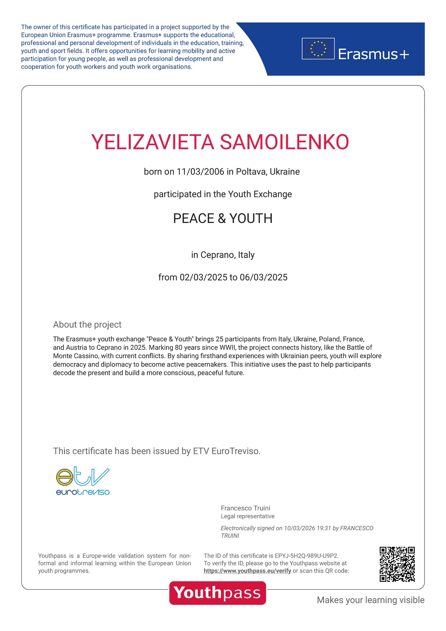 Developing civic awareness, mastering democratic tools, and deepening intercultural dialogue are essential components of modern European education. Yelizavieta Samoilenko, a 3rd-year student of group 301-FF (speciality 035 “Philology”), successfully realised her potential within the framework of the international youth exchange under the Erasmus+ “Peace and Youth” youth exchange, which took place from March 2 to 6, 2026, in the Italian town of Ceprano, located near the Apennine Mountains.