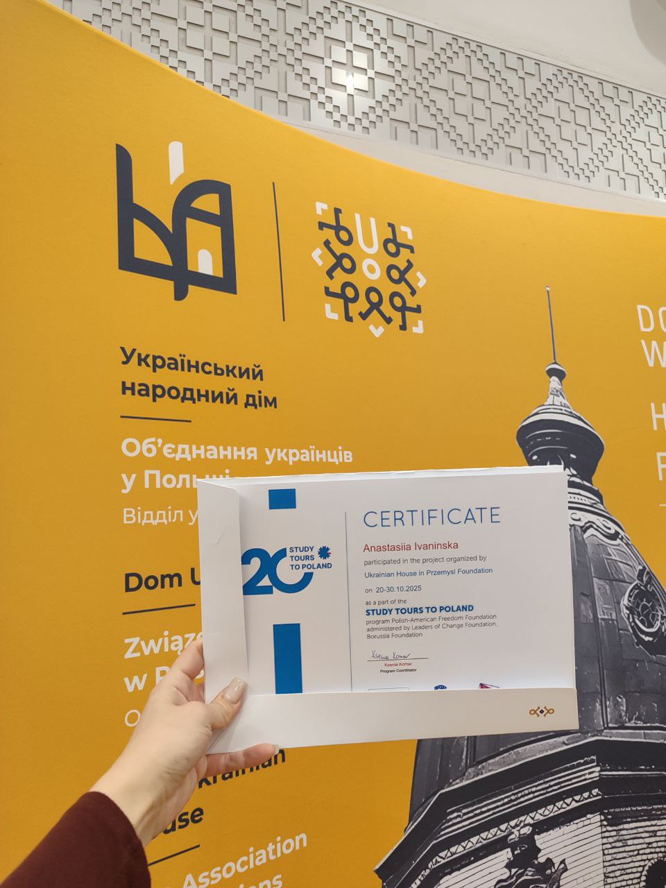 International experience and broadening one’s worldview are key elements of high-quality education, as confirmed once again by the student of the National University “Yuri Kondratyuk Poltava Polytechnic»”. Anastasiia Ivaninska, a student from group 204-NG of the Educational and Research Institute of Oil and Gas (speciality 185 “Oil and Gas Engineering and Technologies”), became one of the participants in the prestigious international grant program “Study Tours to Poland” (STP). Over ten days, from October 20 to October 30, 2025, in the Polish city of Przemyśl, Anastasiia had a unique opportunity to learn about the European education system, the principles of local self-governance, civic initiatives, and the cultural life of Poland, gaining rich and extremely valuable experience, which she eagerly shares: