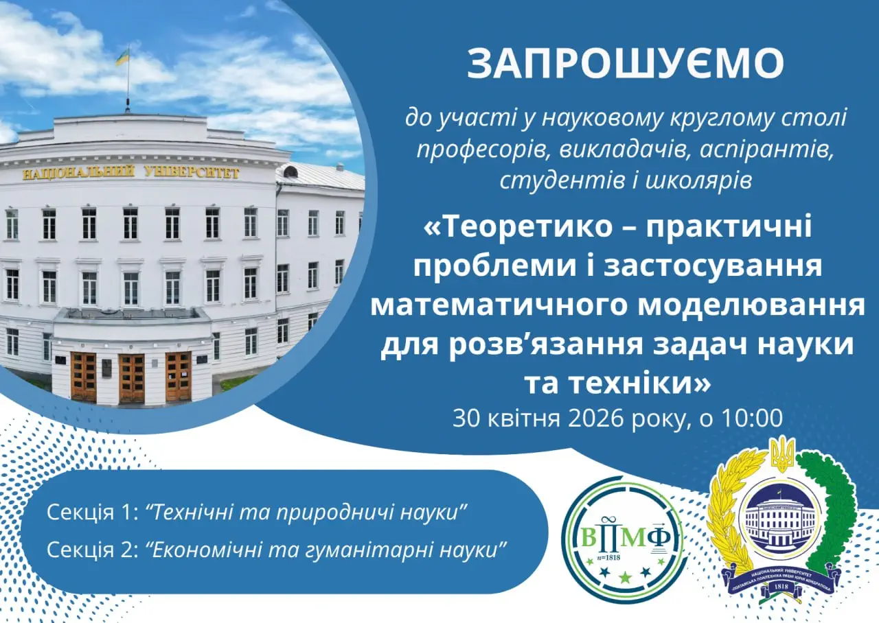 30кві30/04/2026 Науковий круглий стіл професорів, викладачів, аспірантів та студентів університету «Теоретико – практичні проблеми і застосування математичного моделювання для розв’язання задач науки та техніки»