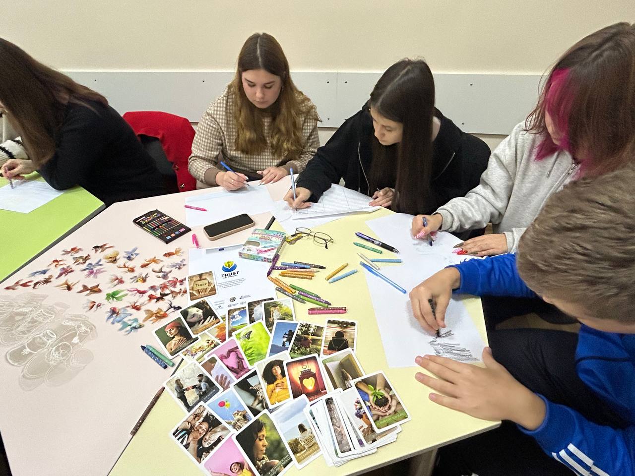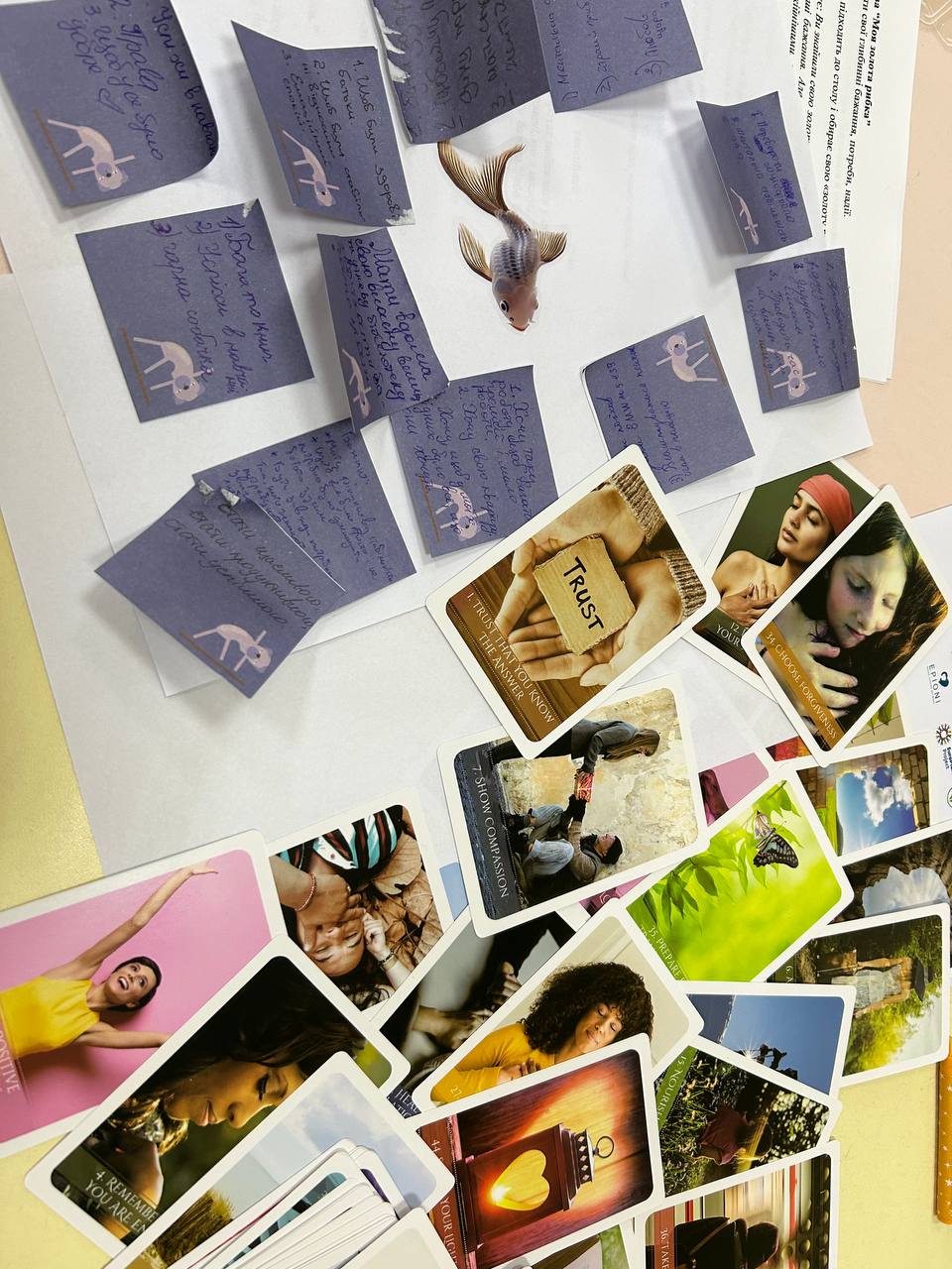 Кульмінацією заняття стала творча частина «Моя золота рибка». Використання архетипу Золотої рибки – символу дива та здійснення мрій – стало потужним проективним інструментом для роботи з бажаннями, що здаються недосяжними. Фасилітаторки свідомо обмежили бажання матеріальною сферою, сфокусувавши роботу на внутрішніх, психологічних потребах (спокій, віра, впевненість). Цей механізм спонукав молодь до глибокої саморефлексії, допомагаючи усвідомити, що для справжнього щастя та рівноваги необхідна внутрішня трансформація, а не лише зовнішні зміни. Подальше обговорення «Мої бажання – мої ресурси» стало ключовим моментом для розвитку самоефективності – учасники ідентифікували власні внутрішні якості, які є необхідними для реалізації цих нематеріальних бажань. Це зміщує фокус з позиції жертви обставин на позицію активного творця власного життя.