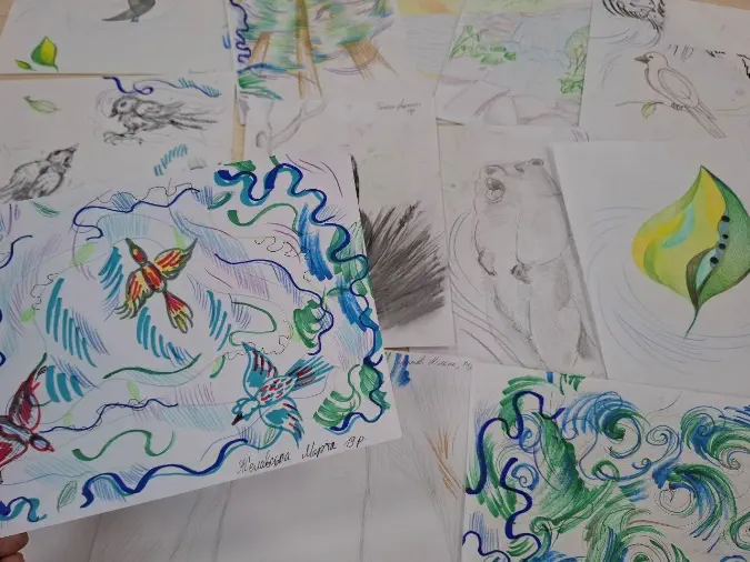 Для цієї сесії Олена Острогляд та Марина Тесленко ретельно підібрали звуковий супровід: шелест букового лісу, спів птахів, дзижчання джмелів. Ці природні звуки асоціюються зі спокоєм, мирним плином життя та природним циклом, що існує поза людськими конфліктами. Їхнє сприйняття в безпечному середовищі сприяє зниженню рівня тривоги та гіперпильності, переводячи фокус уваги з потенційних загроз на заспокійливі та стабільні явища. Учасники працювали з аркушами паперу та різноманітними художніми матеріалами, що дозволило їм вільно виражати емоції, асоціації та відчуття, викликані звуками, перетворюючи невидимі звукові хвилі на візуальні образи – від абстрактних форм до конкретних об’єктів.