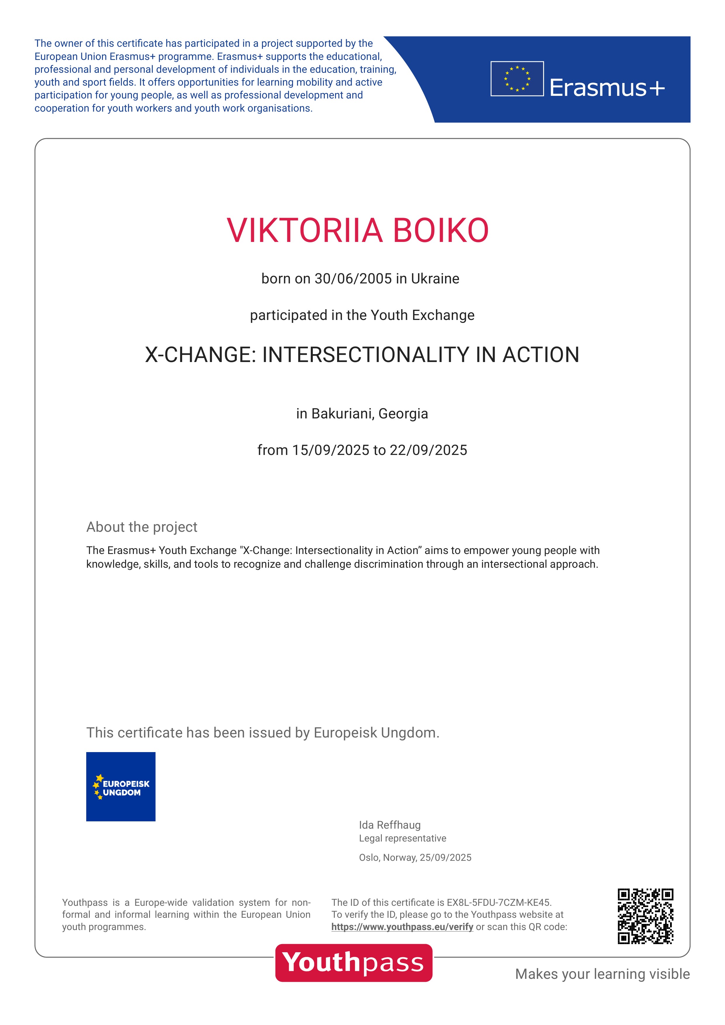Проєкт “X-Change: Intersectionality in Action” мав важливе значення для мене і, можу впевнено сказати, для всіх інших учасників, адже ми спробували усвідомити, як перетин різних ідентичностей впливає на соціальний досвід людини. Ми дійшли висновку, що інтерсекційність є ключем до розуміння нерівності, оскільки дозволяє побачити, як дискримінація може посилюватися через поєднання кількох факторів.