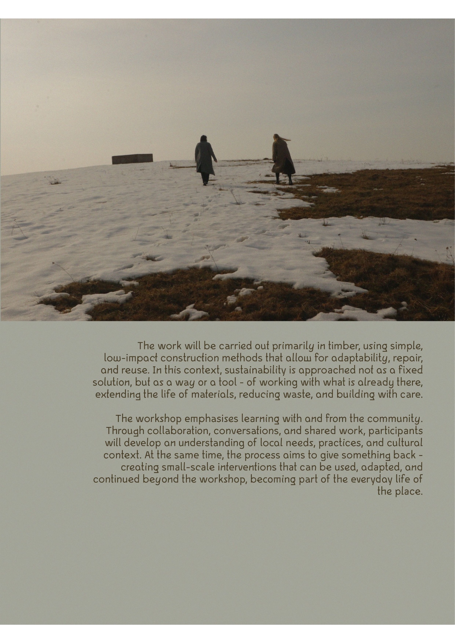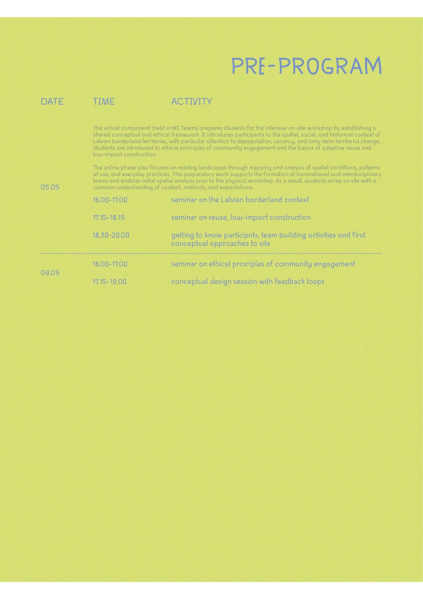 Мобільність проходитиме у місті Індра, розташованому на східному кордоні Латвії (край Європейського Союзу). Регіон Латгале відомий своєю багатошаровою ідентичністю, культурними впливами та багатою дерев'яною архітектурою. Нині територія стикається з депопуляцією, наявністю занедбаних будівель та новими геополітичними реаліями (посилена присутність держави, оборонні системи).