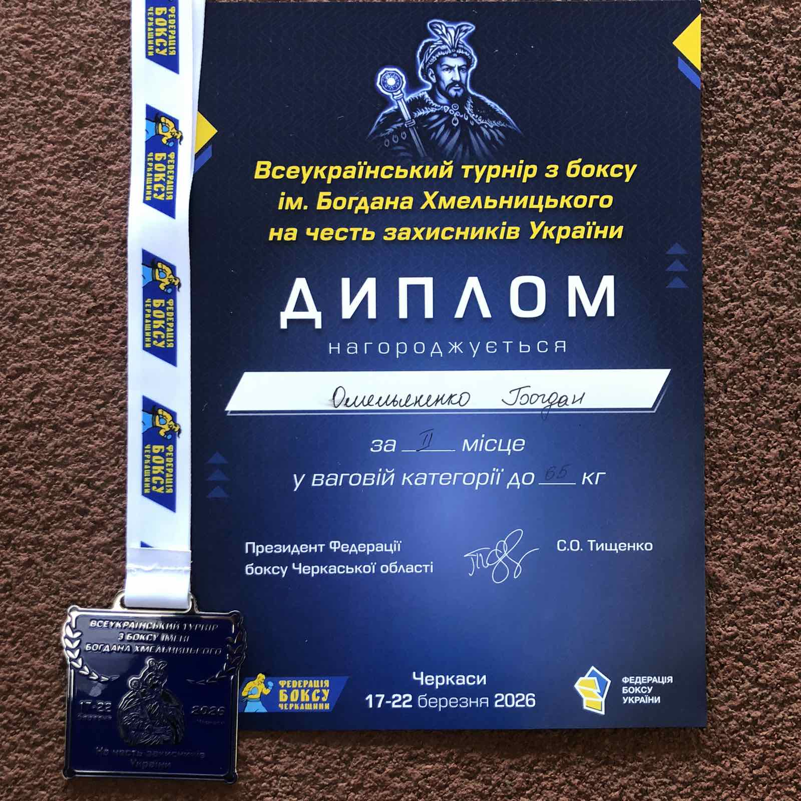 Із 17 по 22 березня у м. Черкаси відбувся Всеукраїнський турнір із боксу імені Богдана Хмельницького, присвячений захисникам України. Богдан ОМЕЛЬЯНЕНКО, студент групи 402-ФС факультету фізичної культури та спорту, гідно представив університет на Всеукраїнському турнірі з боксу. У напруженій боротьбі спортсмен продемонстрував високий рівень підготовки, витримку та справжній бійцівський характер, здобувши срібну нагороду (2 місце) у ваговій категорії до 65 кг. Крім цього, Богдан був відзначений почесною нагородою «За волю до перемоги», яка є визнанням його незламності, сили духу та прагнення до результату.