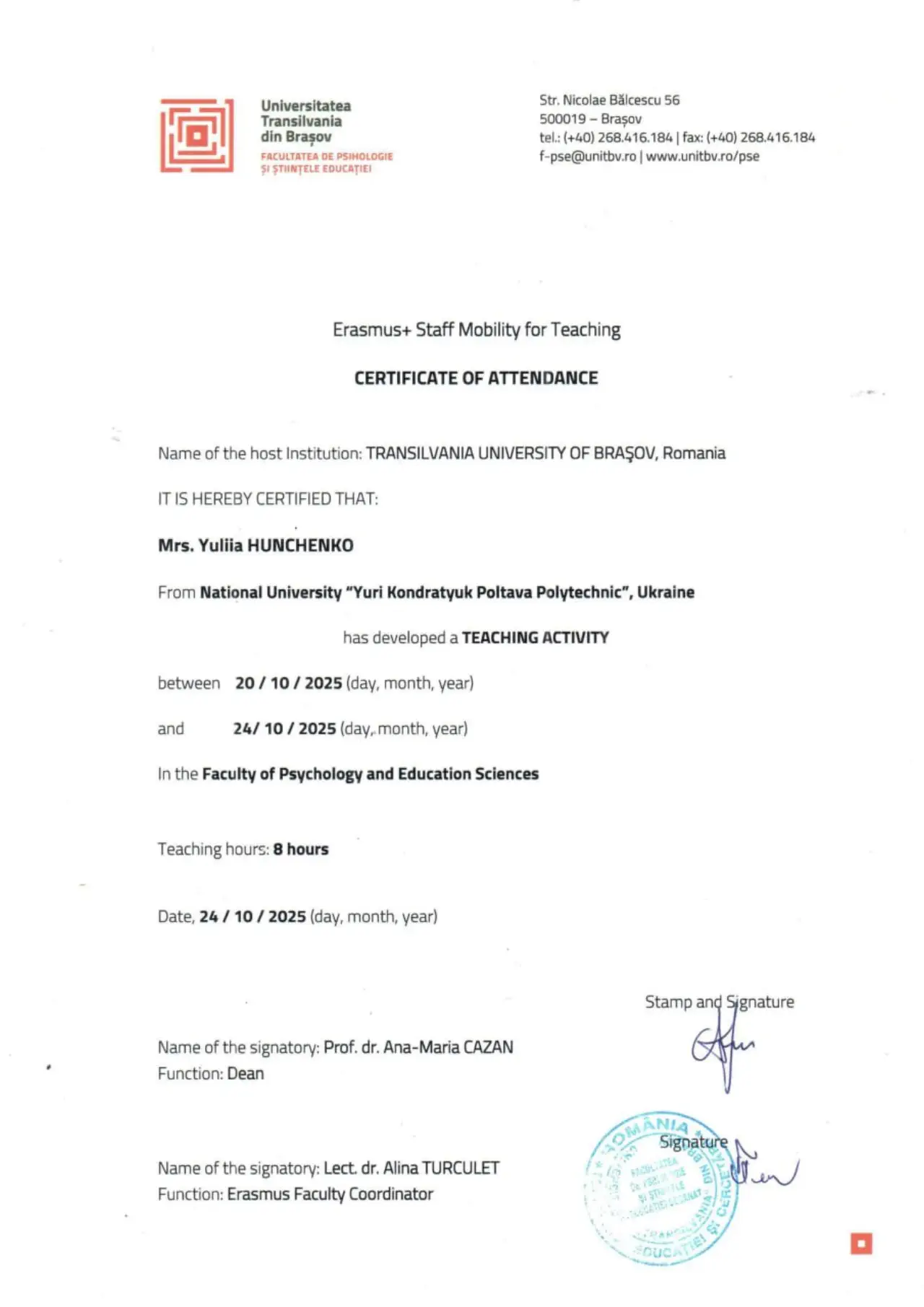 Утверджуючи курс на активну міжнародну інтеграцію та обмін передовим досвідом, Національний університет «Полтавська політехніка імені Юрія Кондратюка» продовжує розширювати свою присутність в освітньому просторі Європи. У рамках програми академічної мобільності для викладачів Erasmus+ старший викладач кафедри загального мовознавства та іноземних мов Юлія Гунченко успішно здійснила навчальну місію у партнерському ЗВО – Трансільванському університеті Брашова / Transilvania University of Brasov (Румунія) з 20 по 24 жовтня 2025 року.