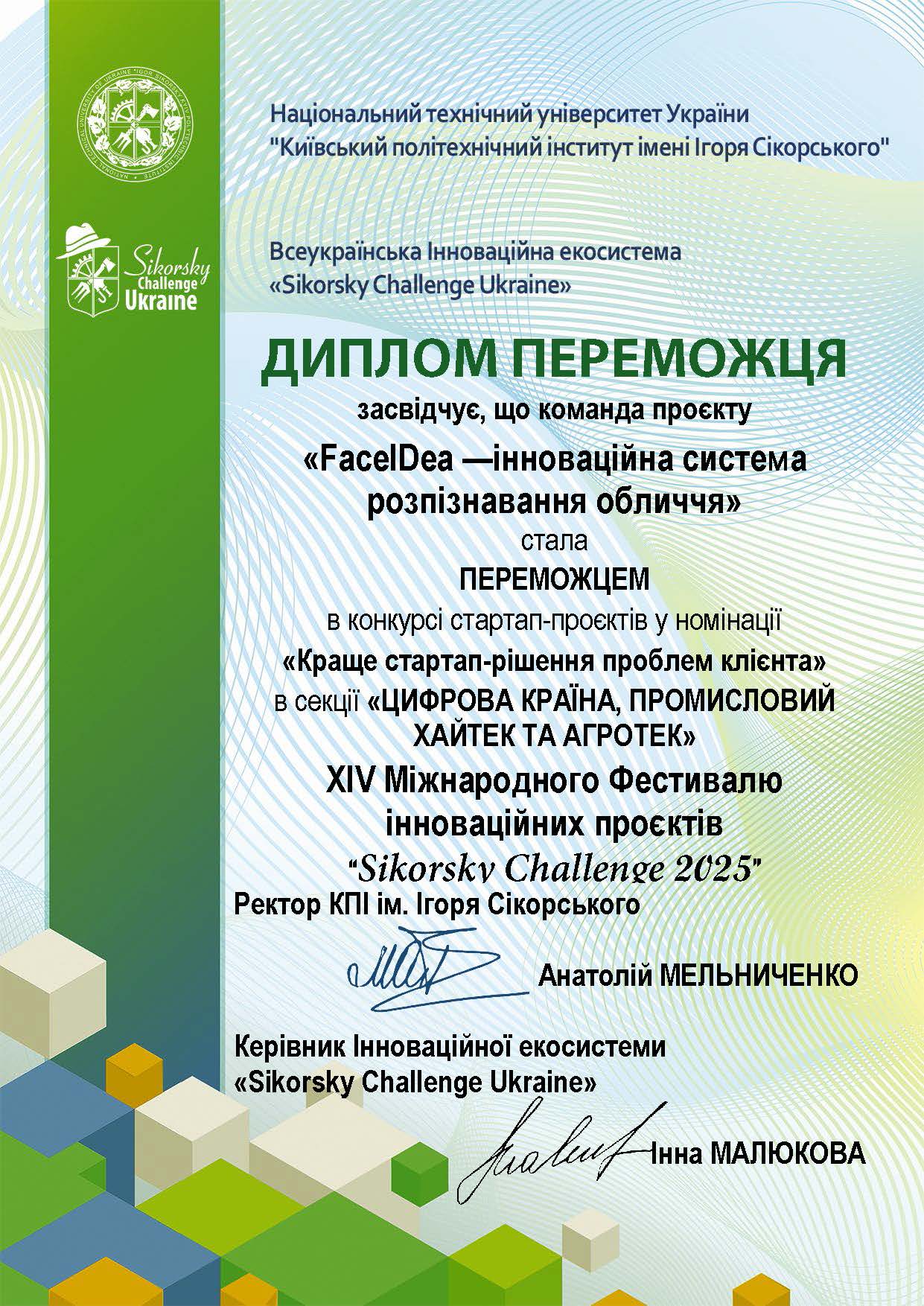 Команда «FaceIDea» у складі студентів 4-го курсу Полтавської політехніки спеціальності 122 Комп’ютерні науки Михайла Котелевського, Івана Олійника, Вікторії Данилко та Артема Тарана під керівництвом старшого викладача кафедри комп’ютерних та інформаційних технологій і систем Олени Гайтан здобула перемогу у номінації «Краще стартап-рішення проблем клієнта» у секції «Цифрова країна, промисловий хайтек та агротек» на XIV Міжнародному фестивалі інноваційних проєктів “Sikorsky Challenge 2025”.