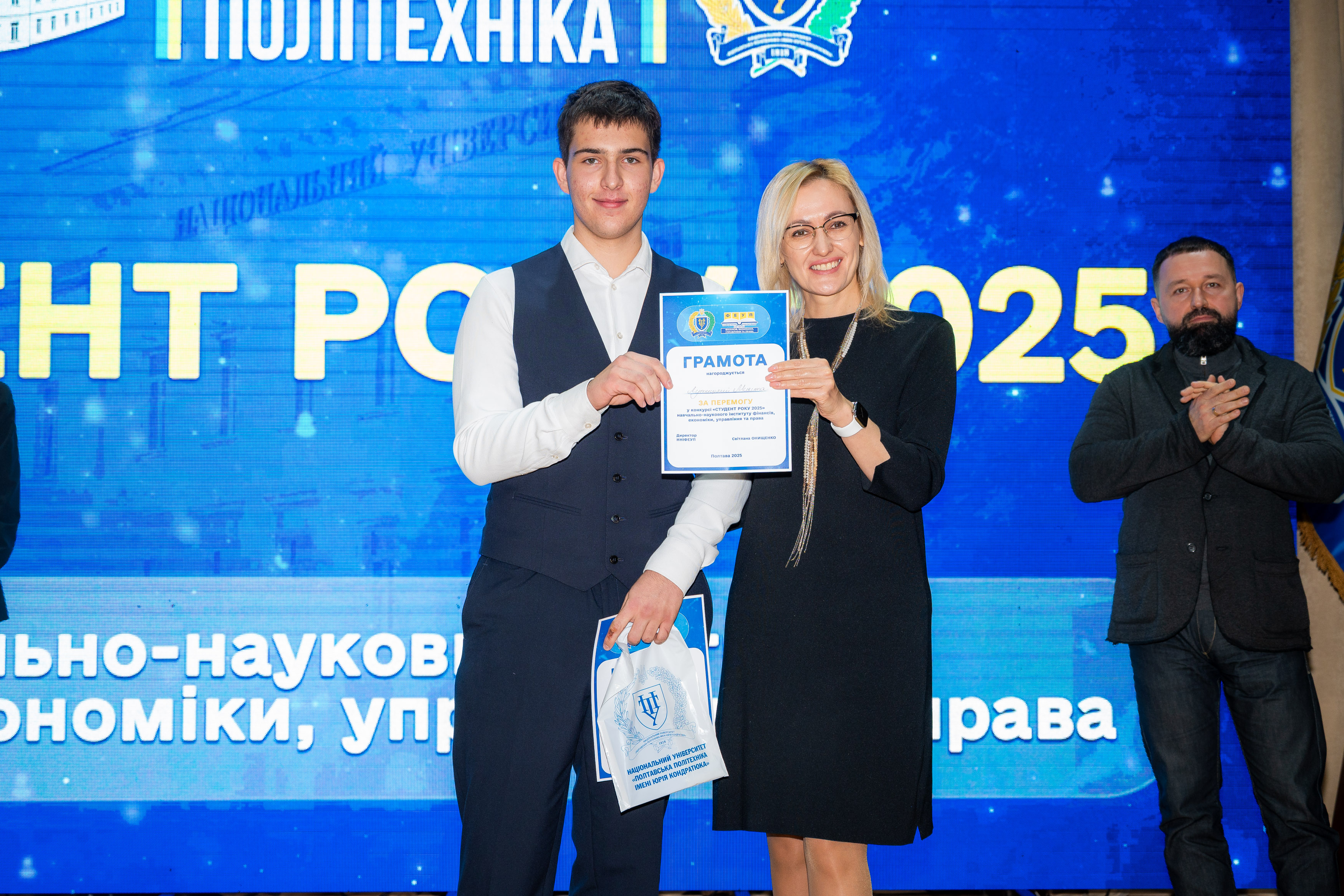 За підсумками всіх конкурсних випробувань переможцем відбіркового етапу конкурсу «Студент року – 2025» Навчально-наукового інституту фінансів, економіки, управління та права став Микита Лутицький, який вразив журі своєю креативністю, артистизмом і впевненістю.