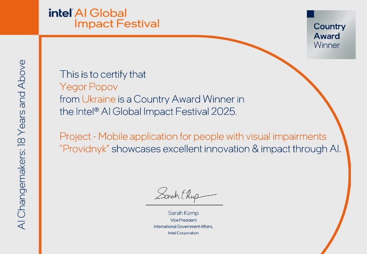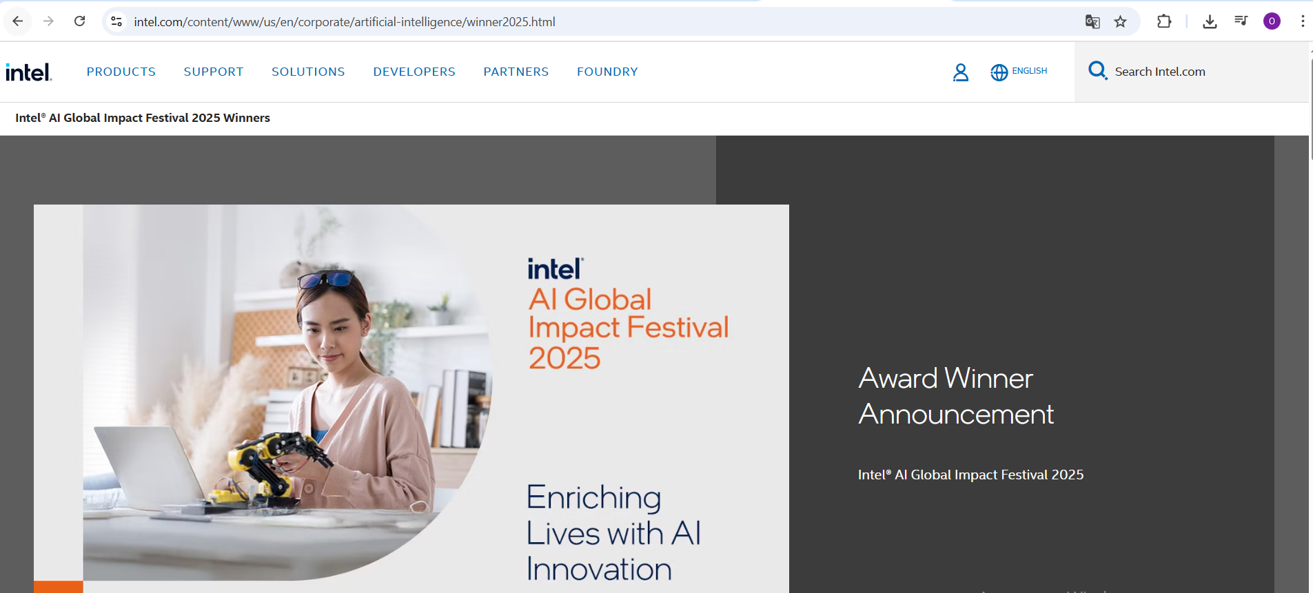Компанія Intel щиро привітала команду з визнанням переможцями конкурсу в категорії «Country/Region/Territory Award Winners» в межах Intel® AI Global Impact Festival 2025 у категорії “18 років і старше”. За словами програмного менеджера команди Intel® AI Global Impact Festival 2025: «Проєкт вирізнився своєю креативністю, важливим впливом і технічною досконалістю».