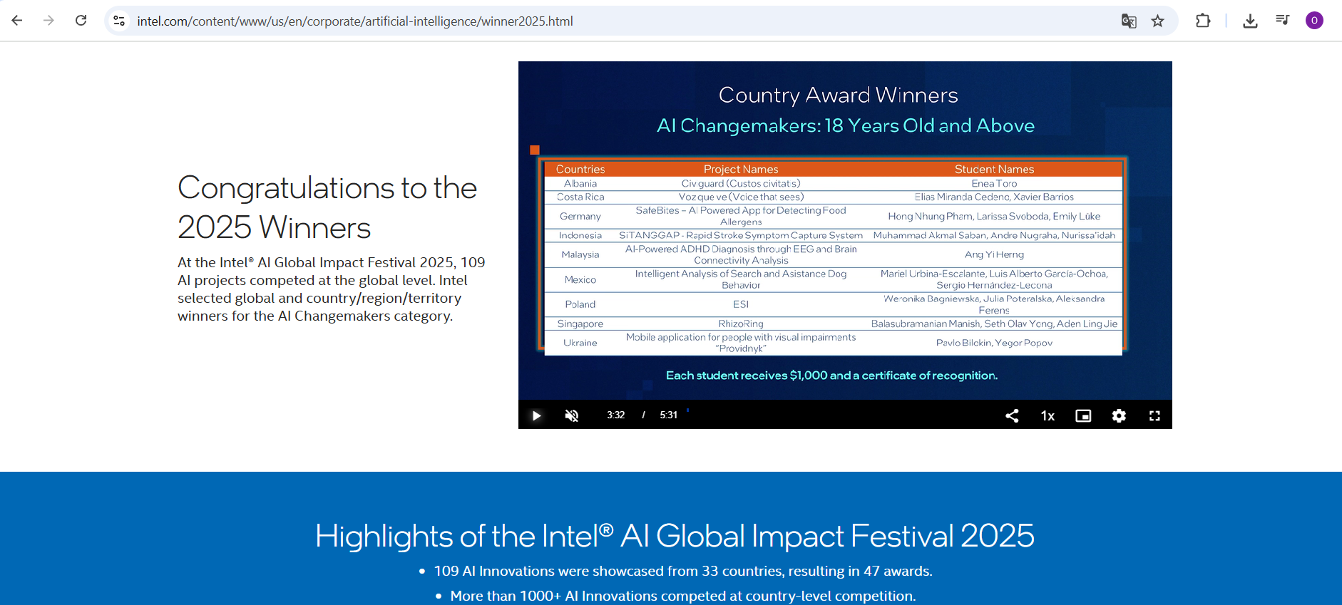 Цьогорічний фестиваль об’єднав на глобальному рівні 109 AI-інновацій із 32 країн світу, а в національних відборах узяло участь понад 1000 проєктів. Intel обрав переможців за глобальним рівнем та країною/регіоном/територією.