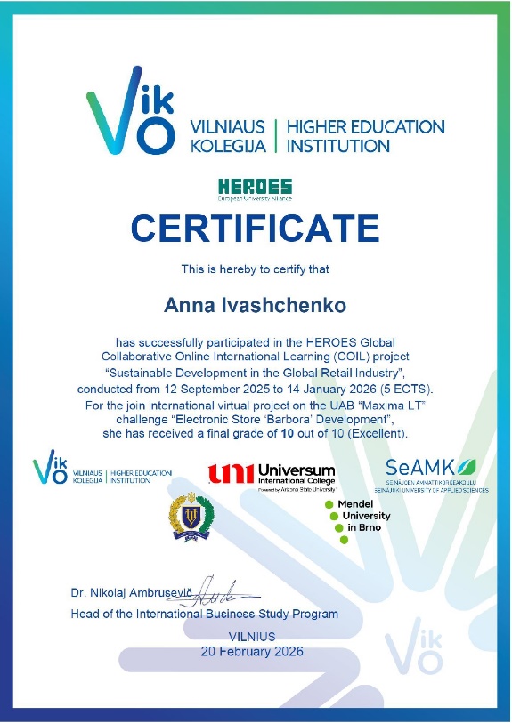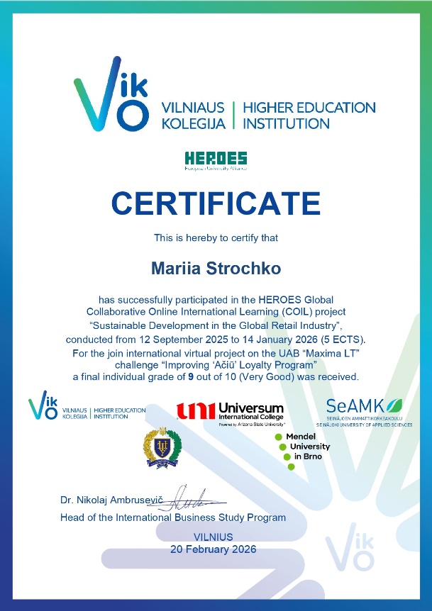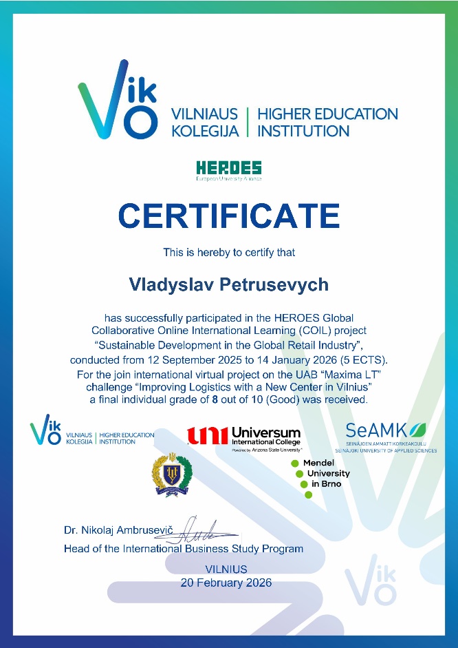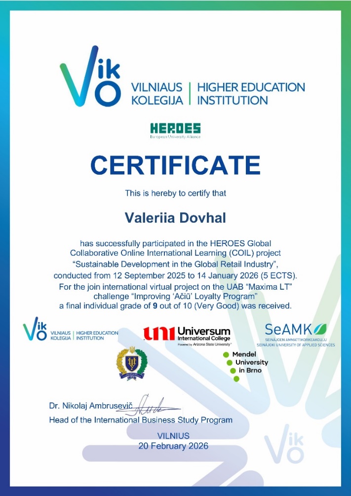 Протягом чотирьох місяців, із вересня 2025 року по січень 2026 року, наші студенти працювали у тісній колаборації з партнерами університету: ВНЗ Вільнюською колегією / Vilniaus kolegija | Higher education institution (VIKO, Литва), Університетом Менделя в Брно (Чехія), Міжнародним коледжем «Універсум» (Косово) та Університетом прикладних наук Сейняйокі (Фінляндія). Навчальний процес включав спільні лекції, інтерактивні заняття та міжкультурні зустрічі під керівництвом провідного європейського експерта – доктора наук Ніколая Амбрусевича (Nikolaj Ambrusevič), завідувача кафедри міжнародного бізнесу VIKO.