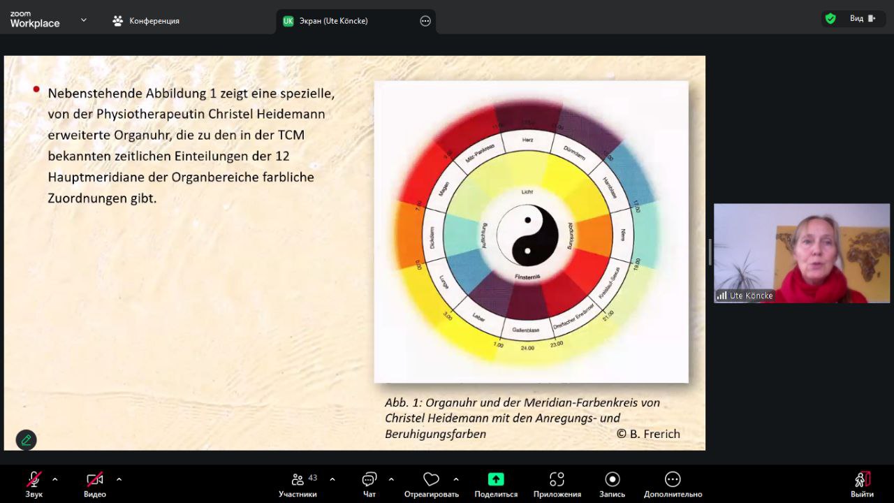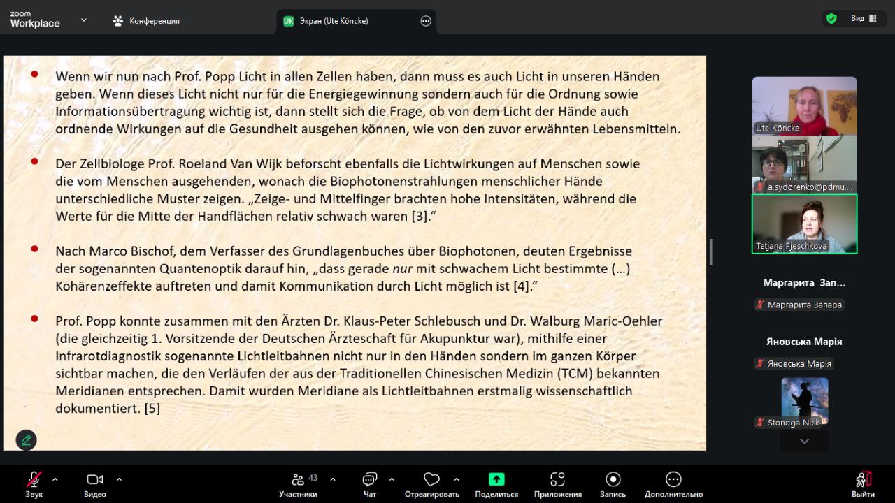 26 листопада 2025 року здобувачі першого (бакалаврського) рівня вищої освіти спеціальностей С4 Психологія і С17 Терапія і реабілітація першого (бакалаврського) та спеціальності С4 Психологія другого (магістерського) рівнів вищої освіти Національного університету «Полтавська політехніка імені Юрія Кондратюка прослухали у онлайн форматі заключну гостьову лекцію німецької дослідниці, доктора медичних наук, практикуючого терапевта пані Уте Кьонке (м. Мюнстер, Німеччина). Учасники разом з експерткою цього разу обговорили дослідження іноземних науковців у галузях біофізики, кіматики, хронобіології та їх роль у вивченні даної методики.