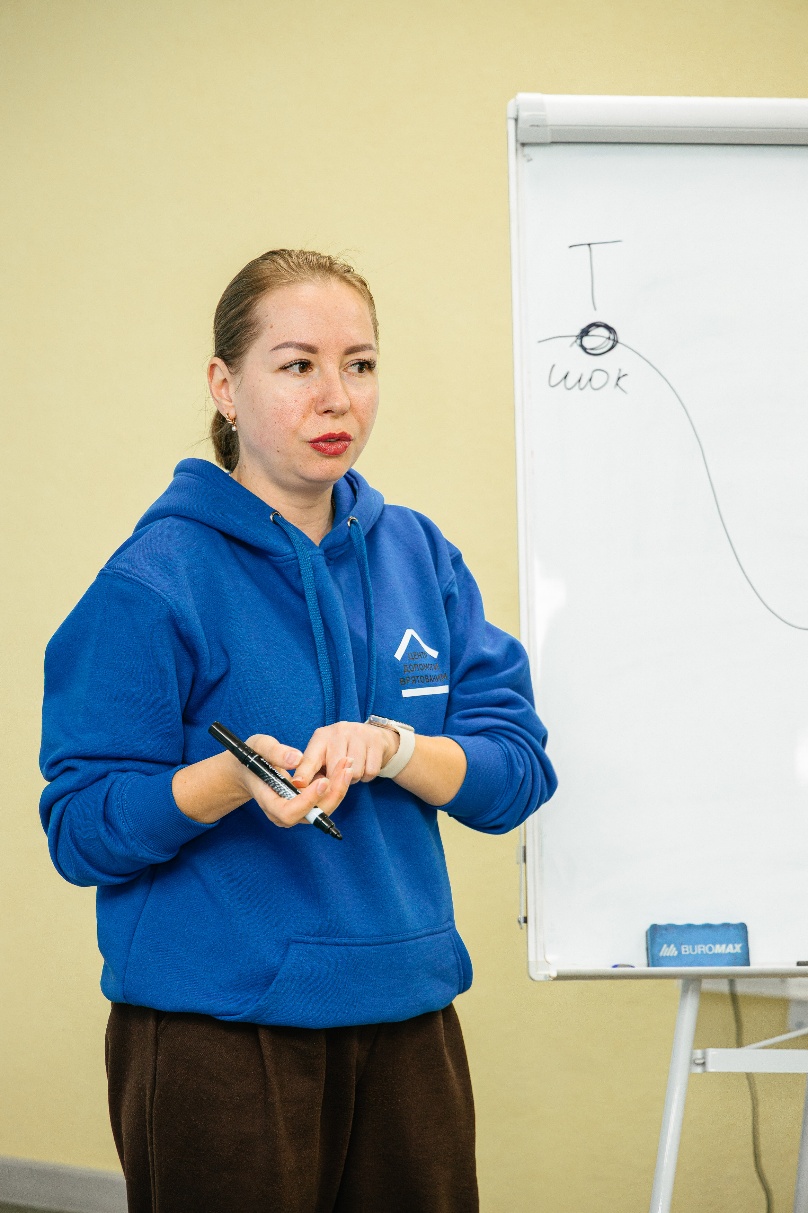 Психологиня Ольга Целовальник познайомила учасників із етапами проживання горя: від шоку та заперечення, які виникають при втраті чи невизначеній втраті, до гніву, торгу, відчуття провини й сорому. Далі можуть слідувати депресія та глибоке горе, які поступово трансформуються у переосмислення й допомагають дійти до останнього етапу — прийняття.