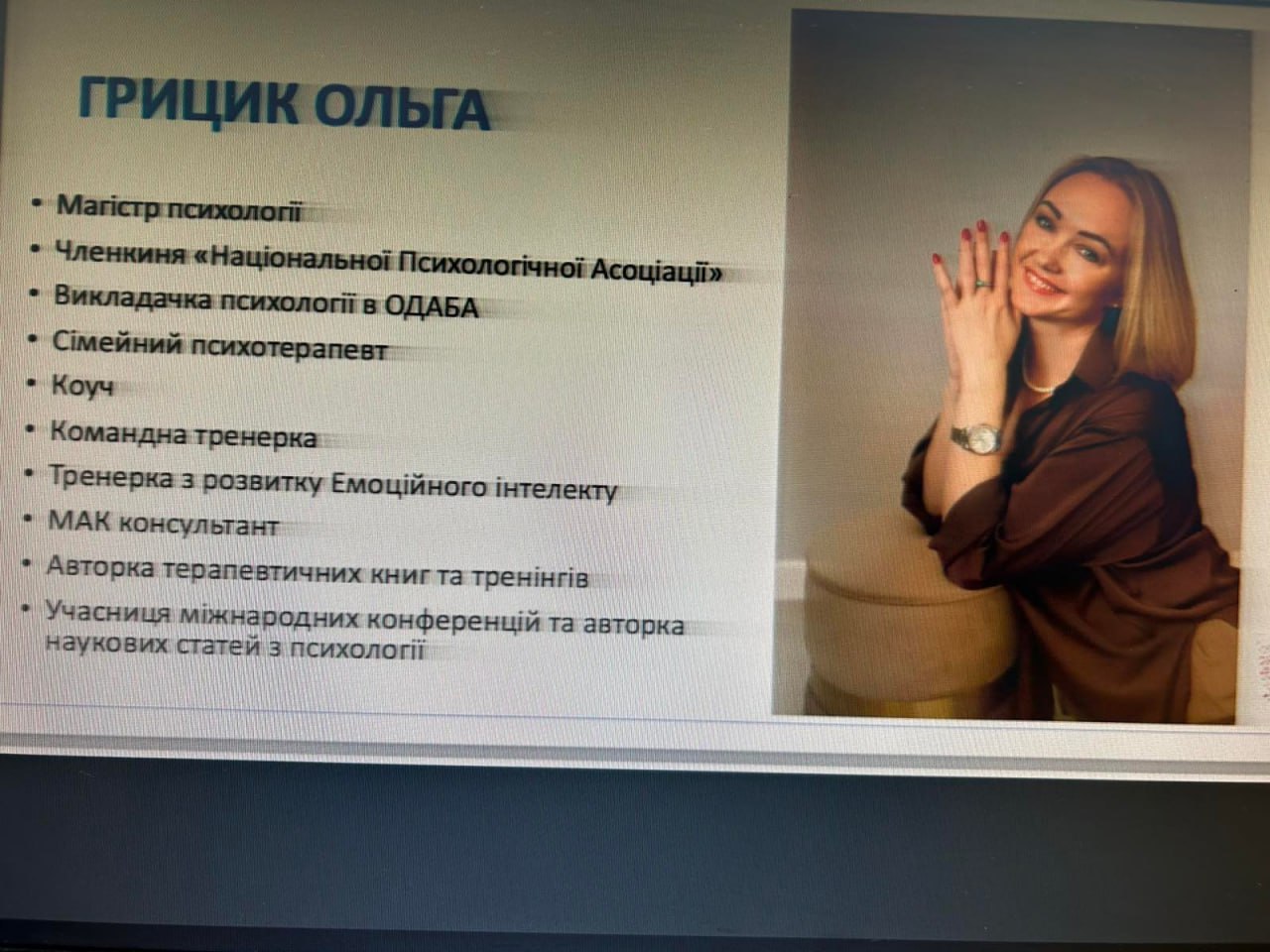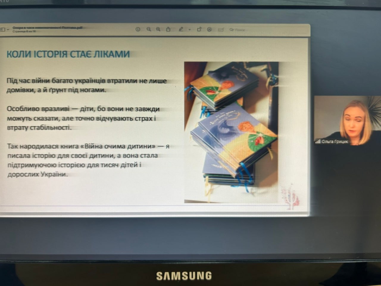 З презентаційною доповіддю виступила авторка книги Ольга Грицик — дитяча психологиня, експерт із терапевтичних казок, заснованих на методах НЛП, арт-терапії, дихальних і метафоричних практик.