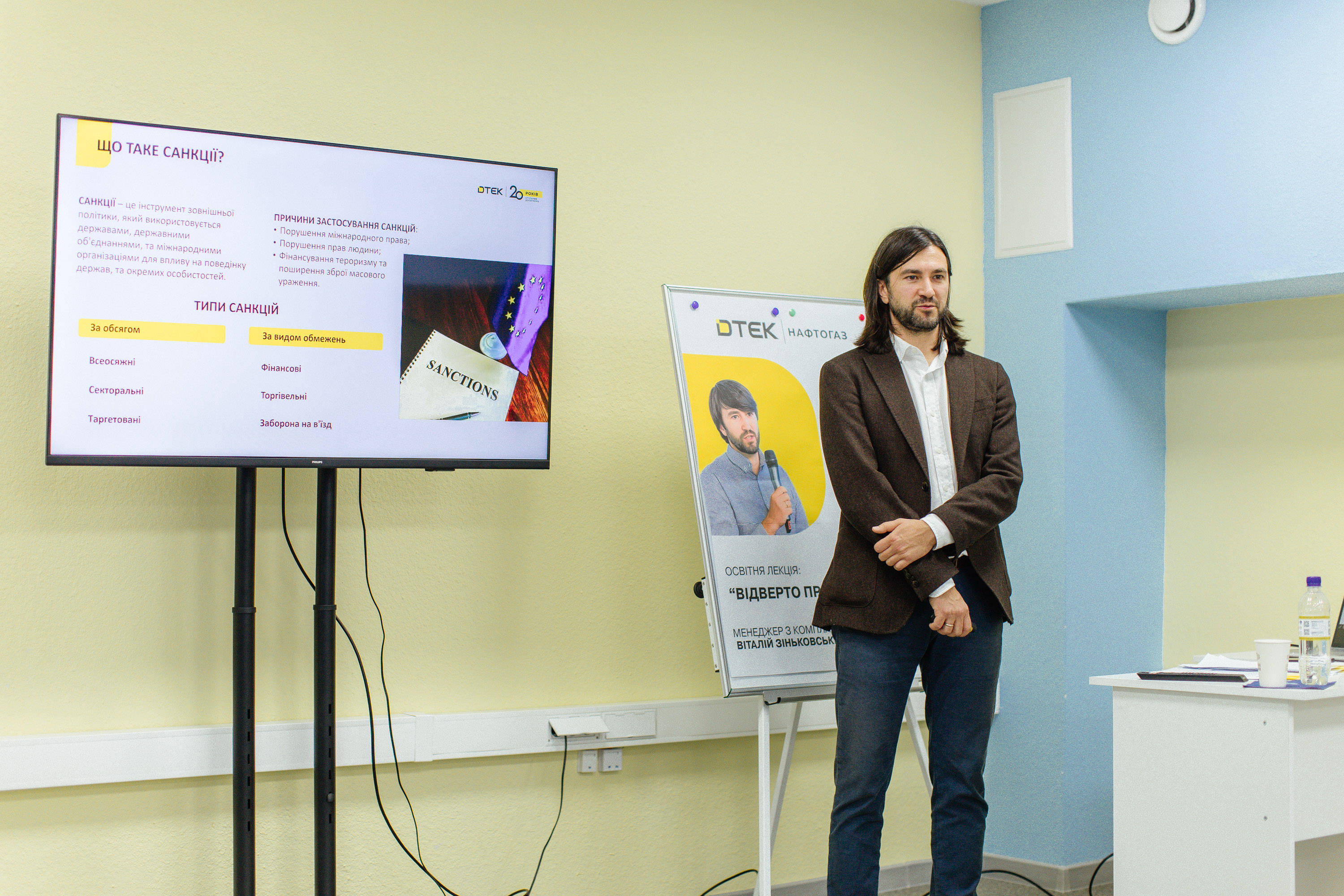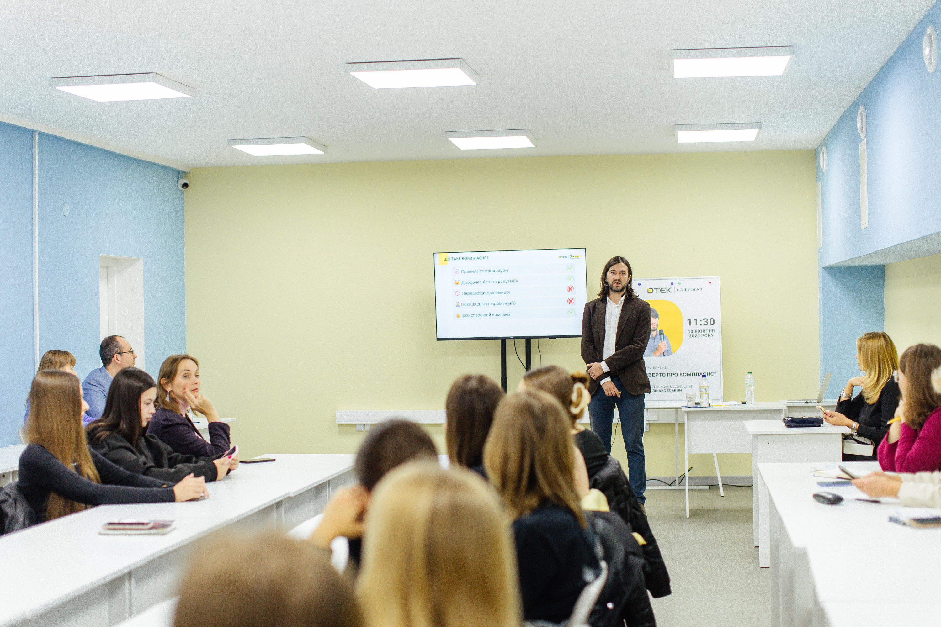 Лекцію для студентів спеціальностей «Фінанси», «Облік і оподаткування», «Менеджмент» та «Право» Навчально-наукового інституту фінансів, економіки, управління та права провів менеджер з комплаєнсу компанії ДТЕК Віталій Зіньковський. Модерував зустріч менеджер відділу з управління персоналом «ДТЕК Нафтогаз», кандидат технічних наук Володимир Гриманюк, який підкреслив важливість співпраці бізнесу та освіти для майбутнього розвитку і відбудови України.