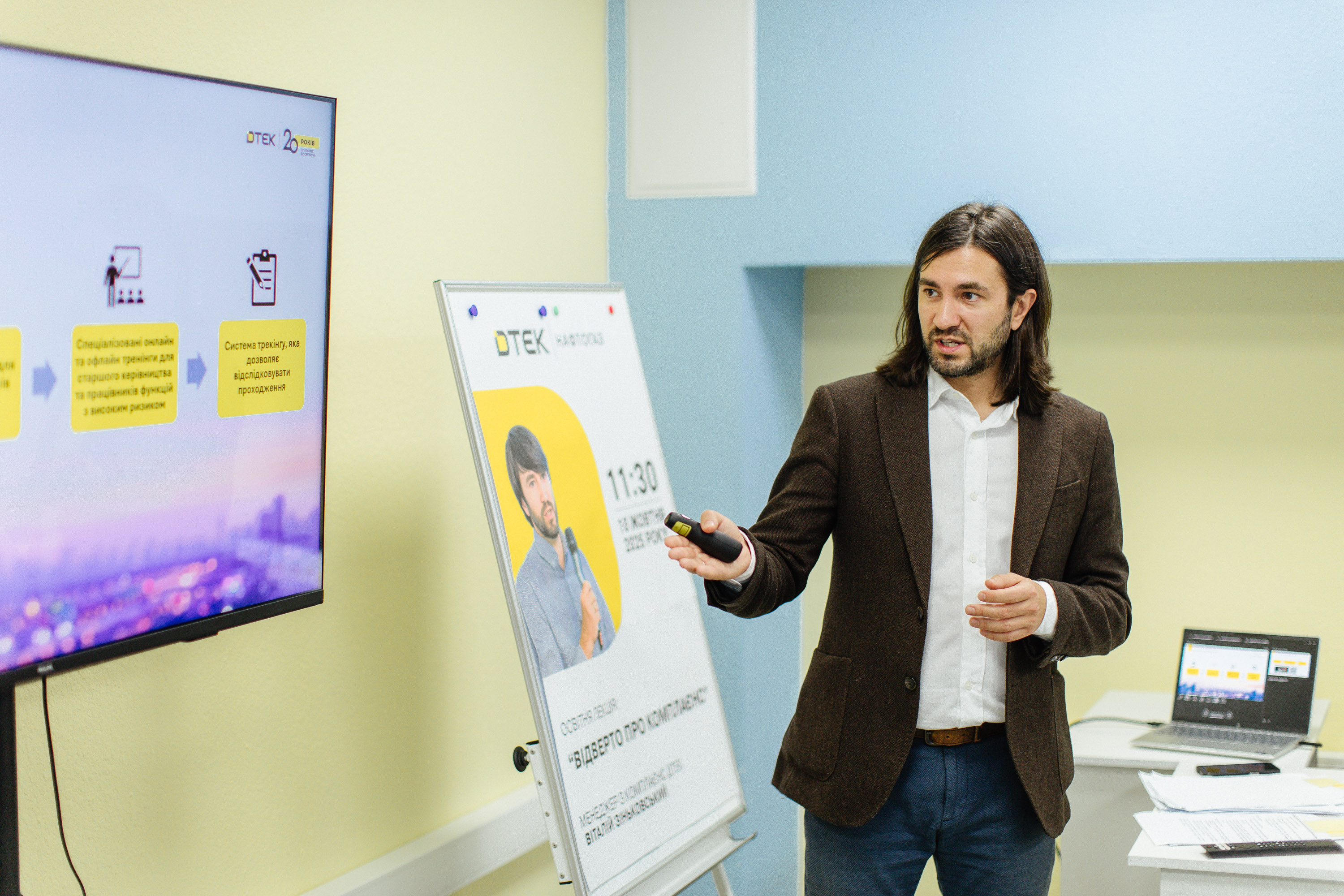Віталій Зіньковський детально зупинився на тому, чим займається Служба комплаєнс у ДТЕК. Зокрема, це розробка нормативних документів у сфері комплаєнсу, оцінка корупційних і санкційних ризиків, проведення тренінгів і просування культури доброчесності серед працівників. Крім того, до функцій служби належать погодження подарунків та проявів гостинності, оцінка конфліктів інтересів, участь у корупційних розслідуваннях і контроль за управлінням інсайдерською інформацією.