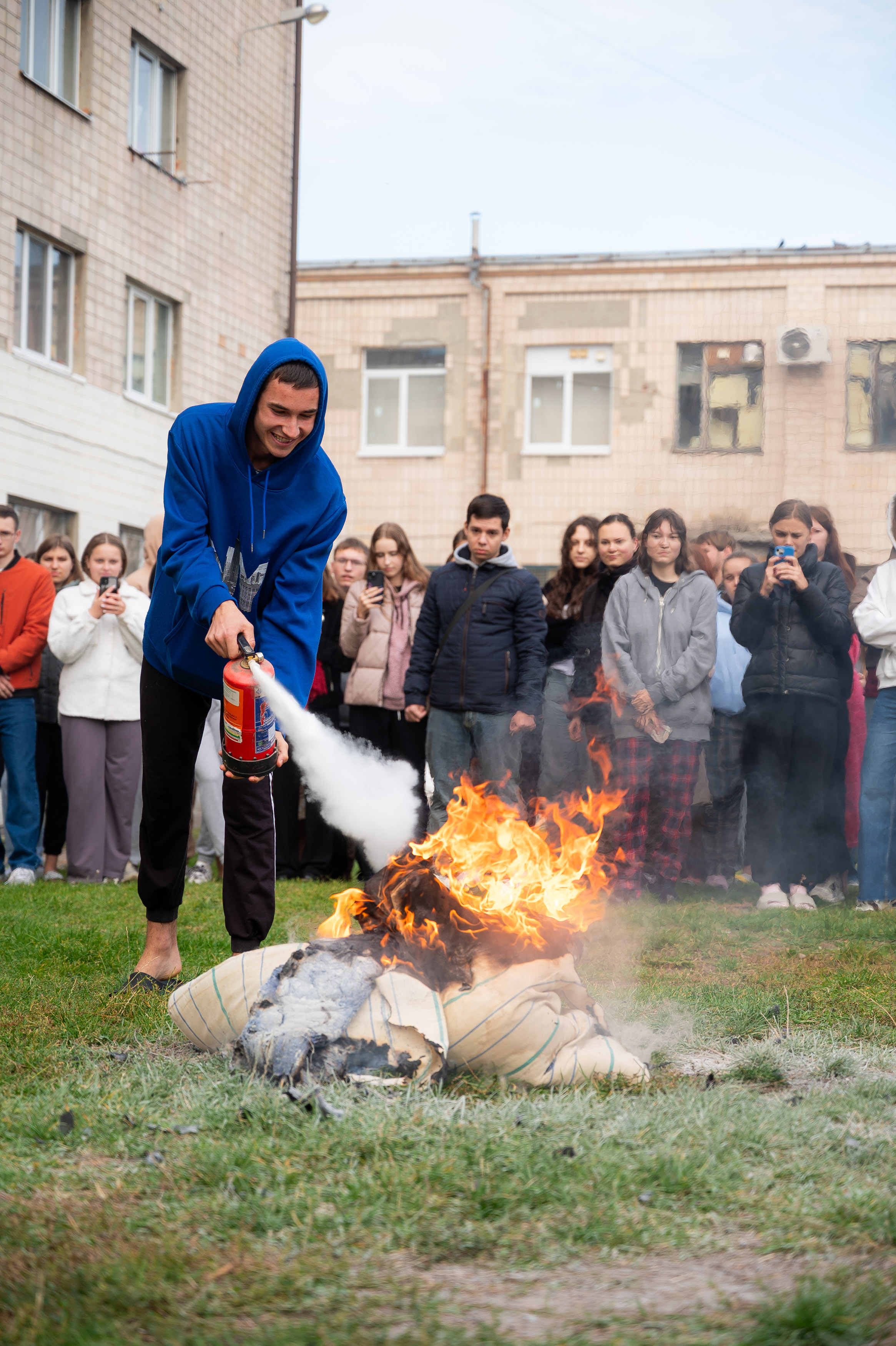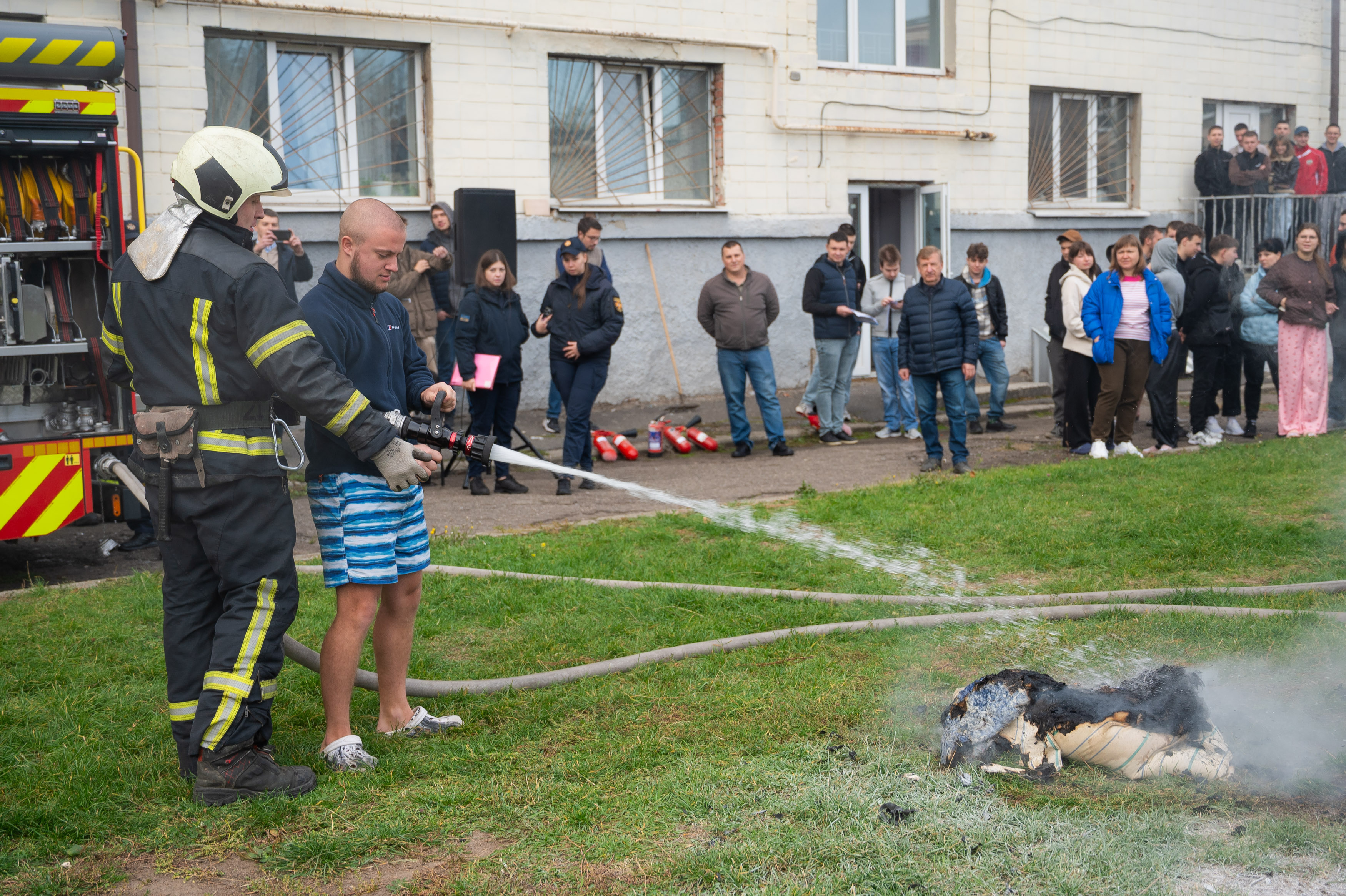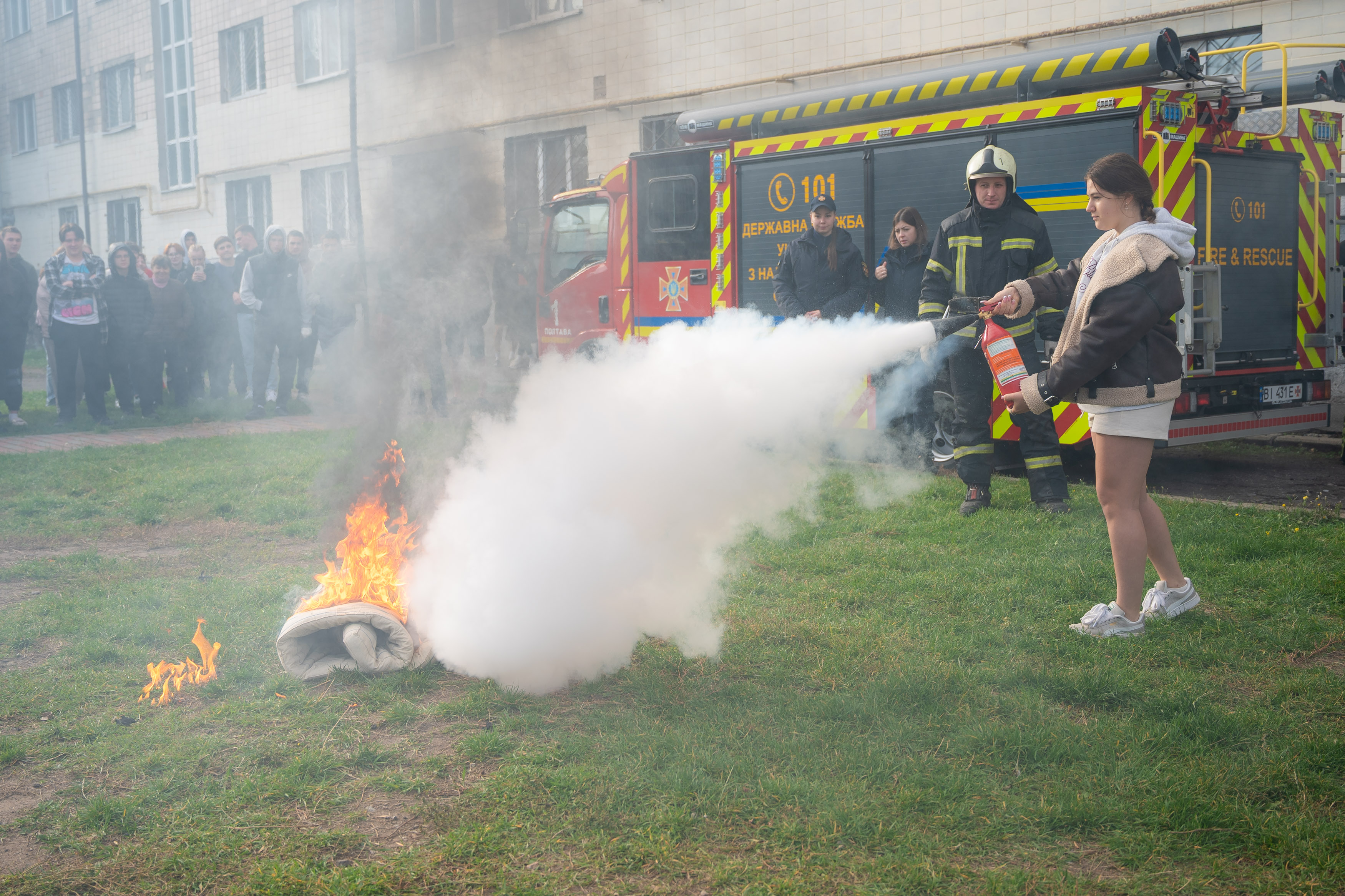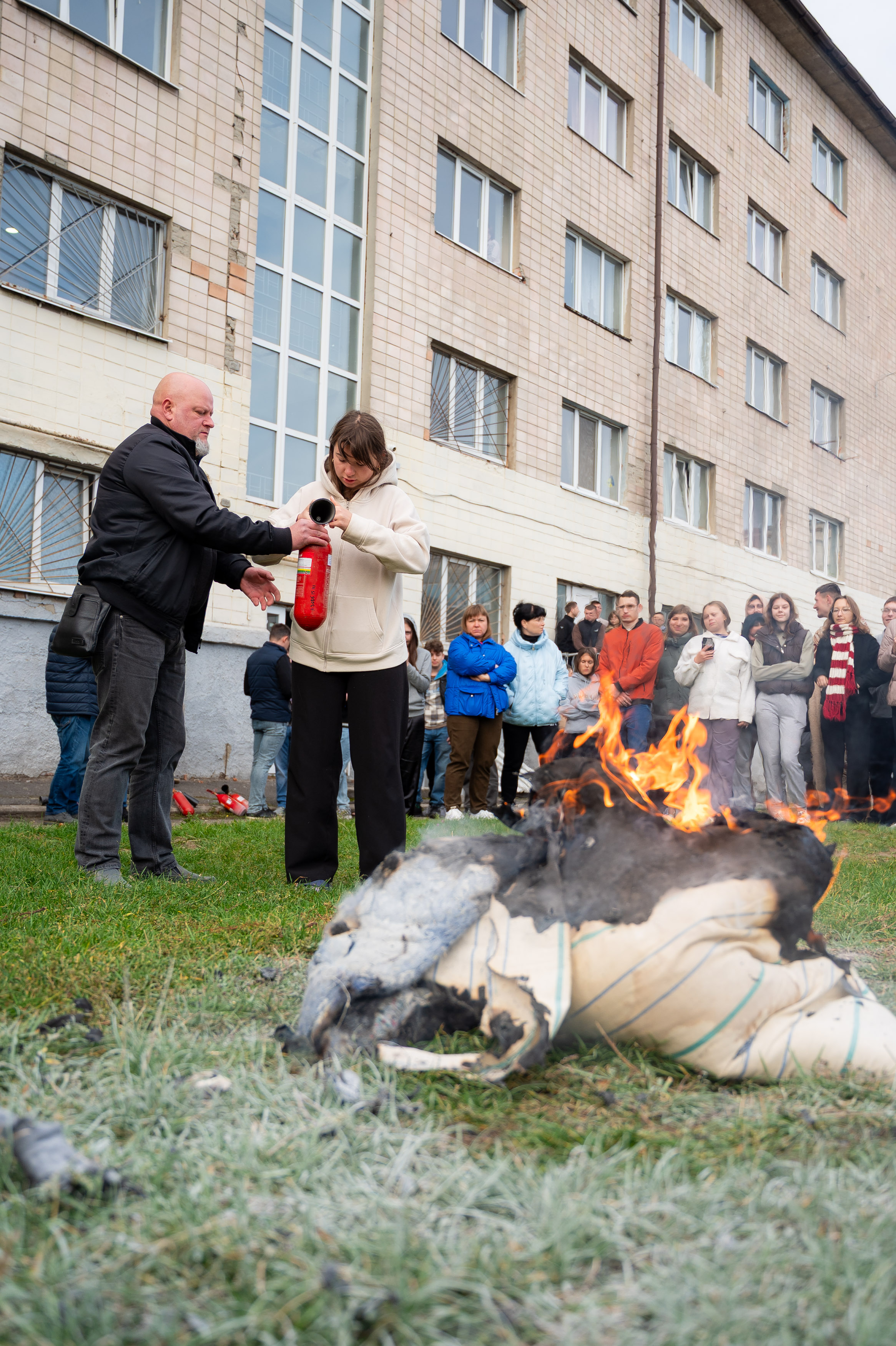 Завершальним етапом тренувань стало практичне відпрацювання навичок користування первинними засобами пожежогасіння. Працівники університету, персонал гуртожитків і студенти мали змогу під керівництвом рятувальників відточити вміння правильно та безпечно користуватися вогнегасником.