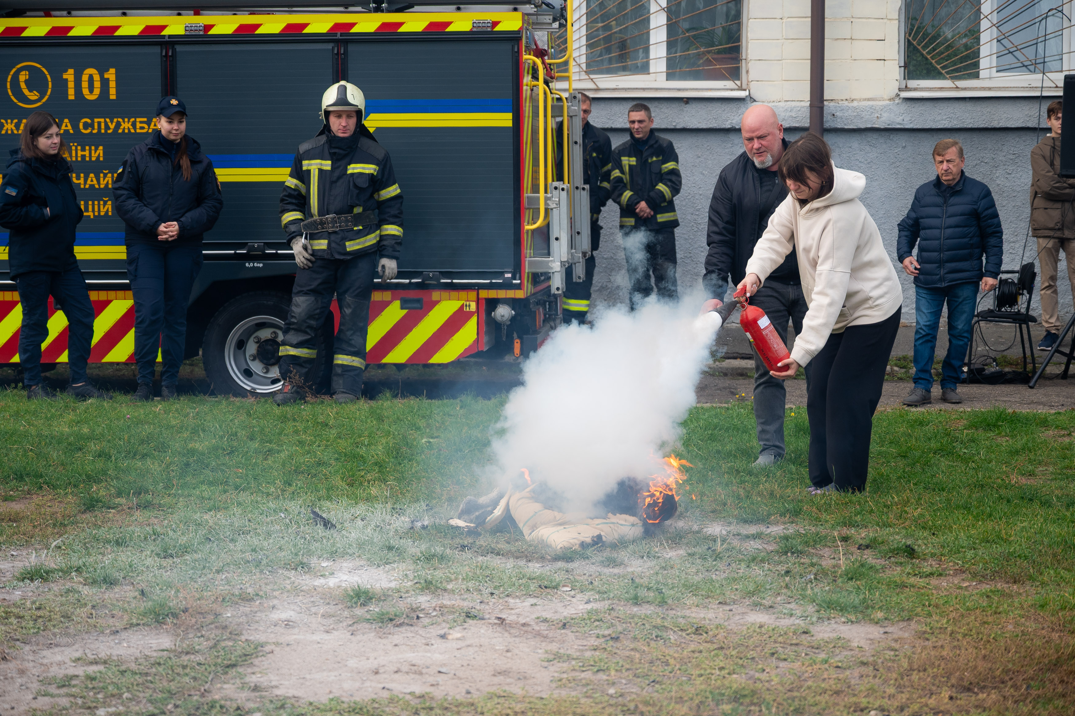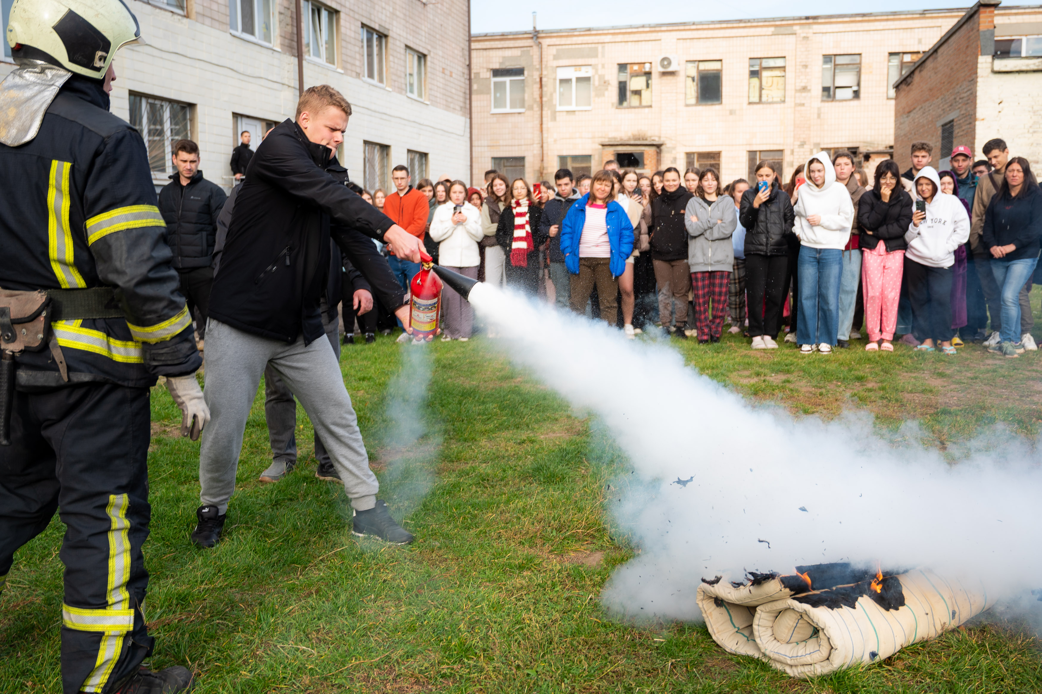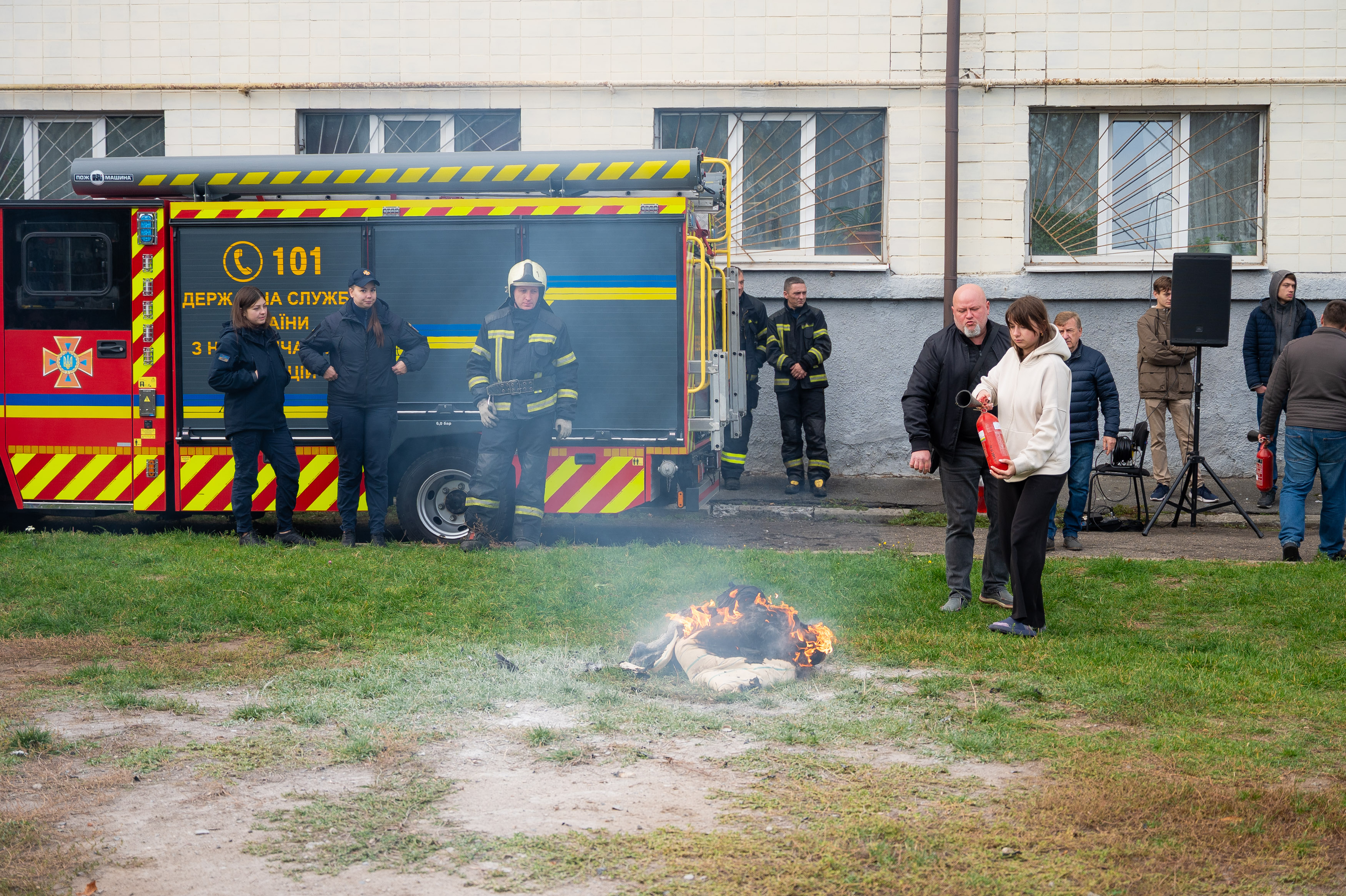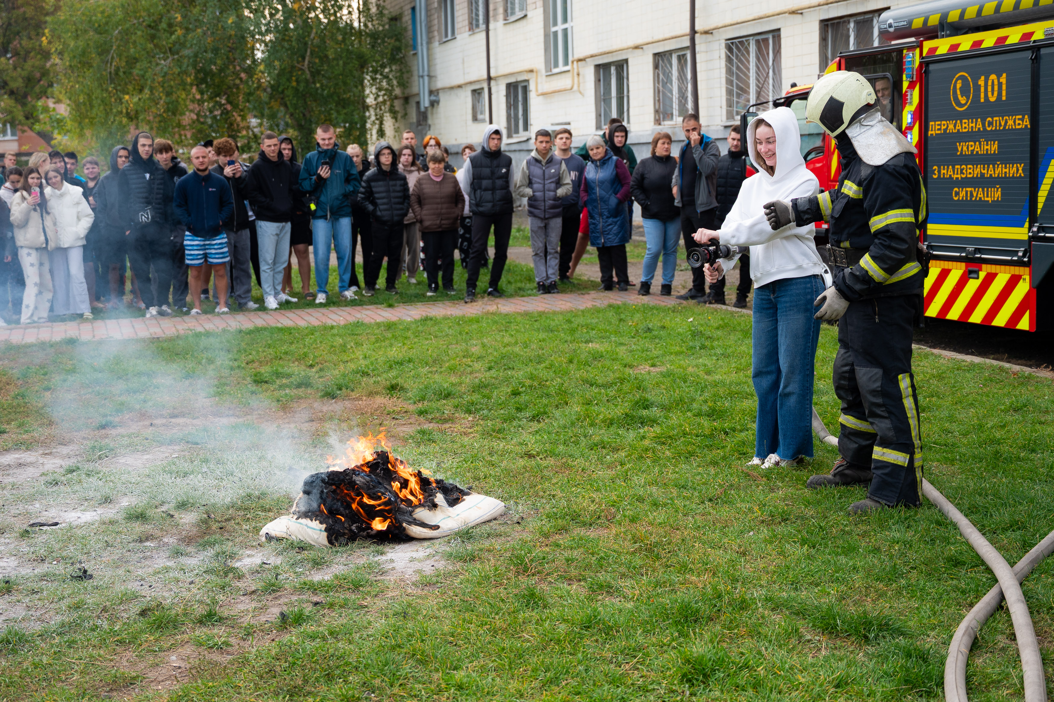 Завершальним етапом тренувань стало практичне відпрацювання навичок користування первинними засобами пожежогасіння. Працівники університету, персонал гуртожитків і студенти мали змогу під керівництвом рятувальників відточити вміння правильно та безпечно користуватися вогнегасником.