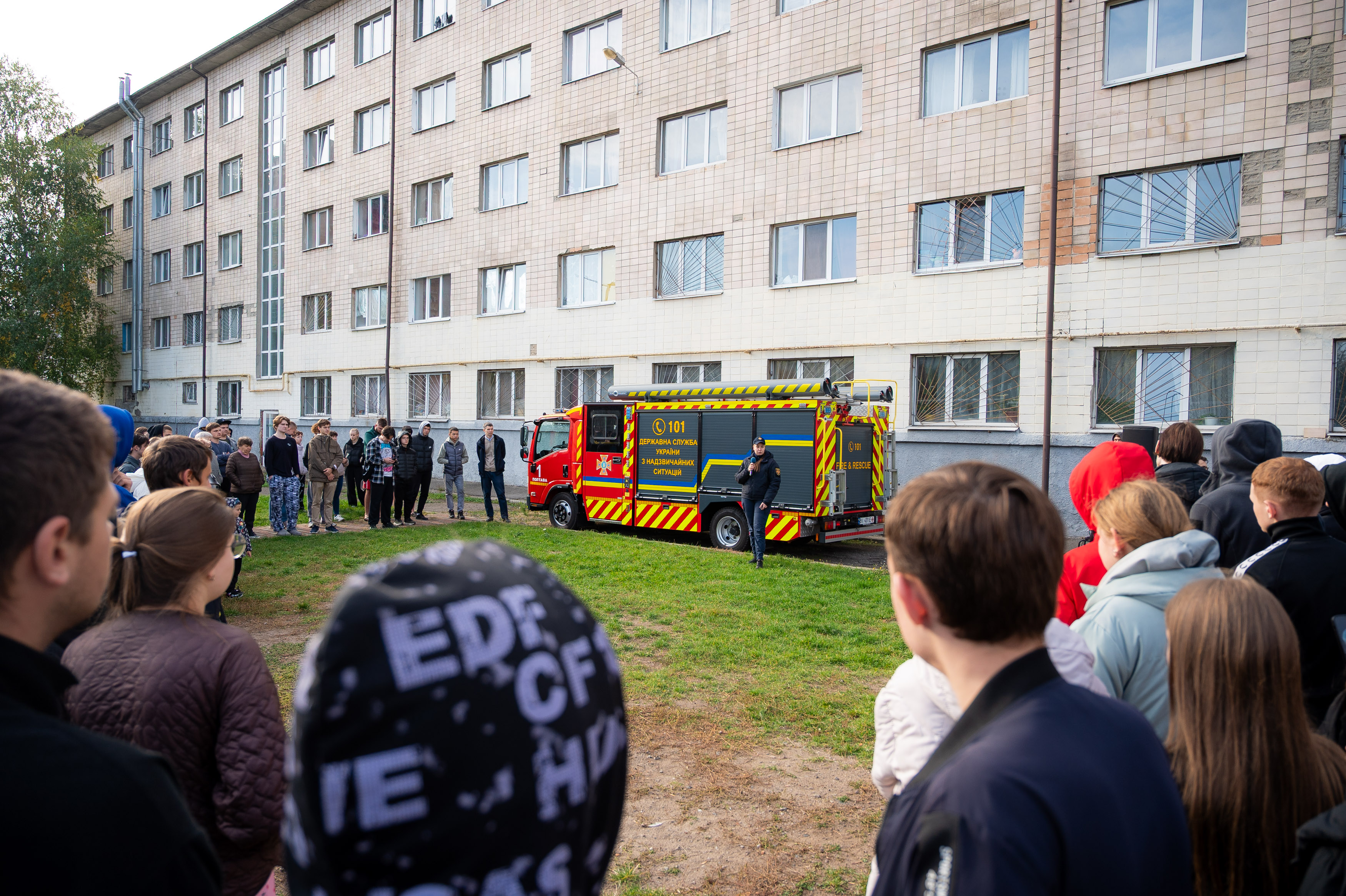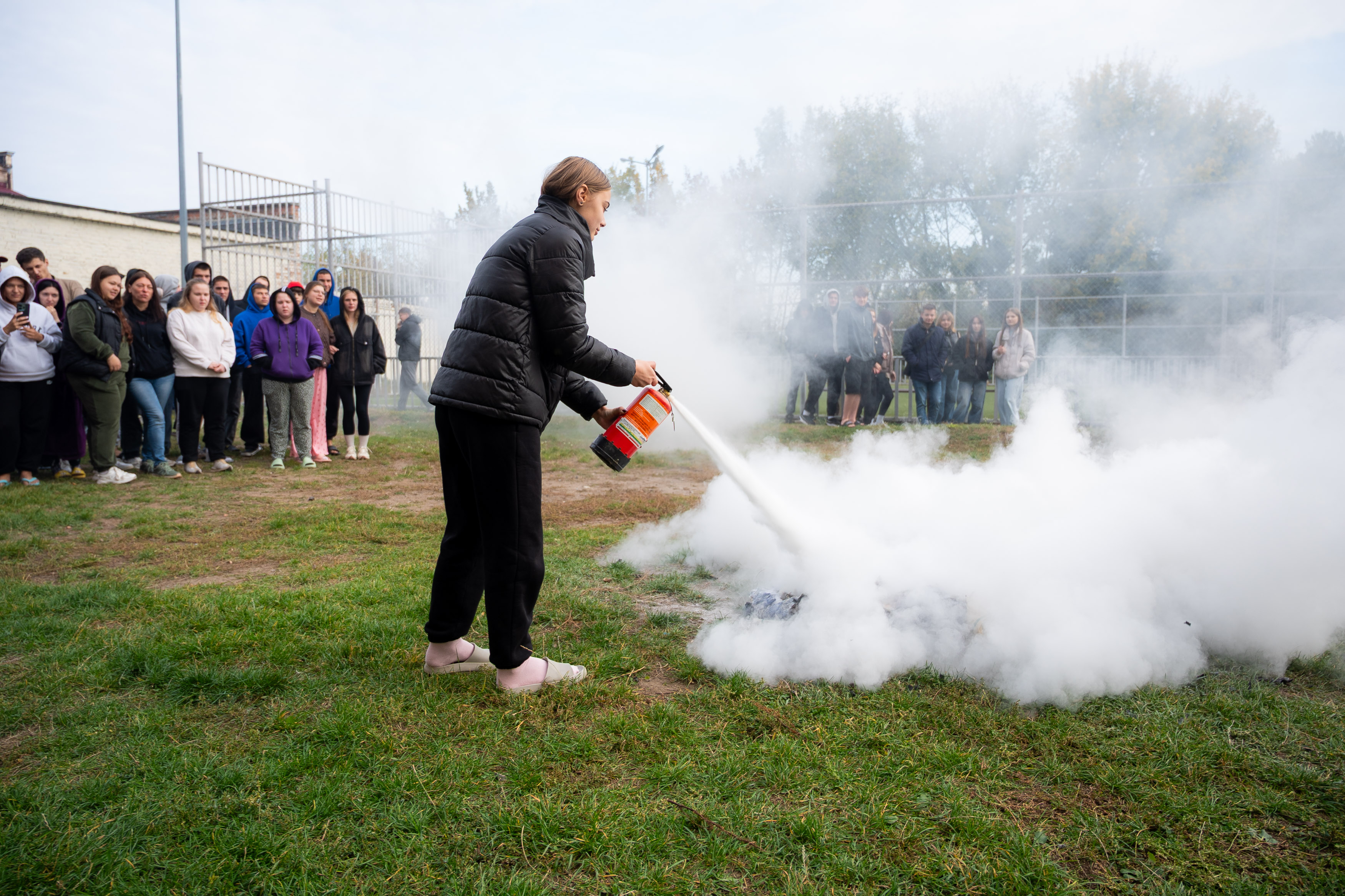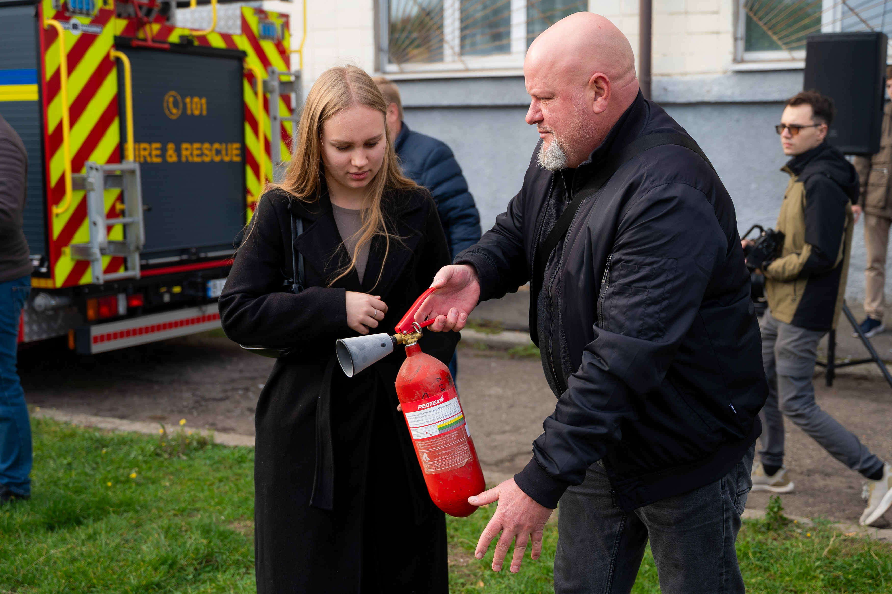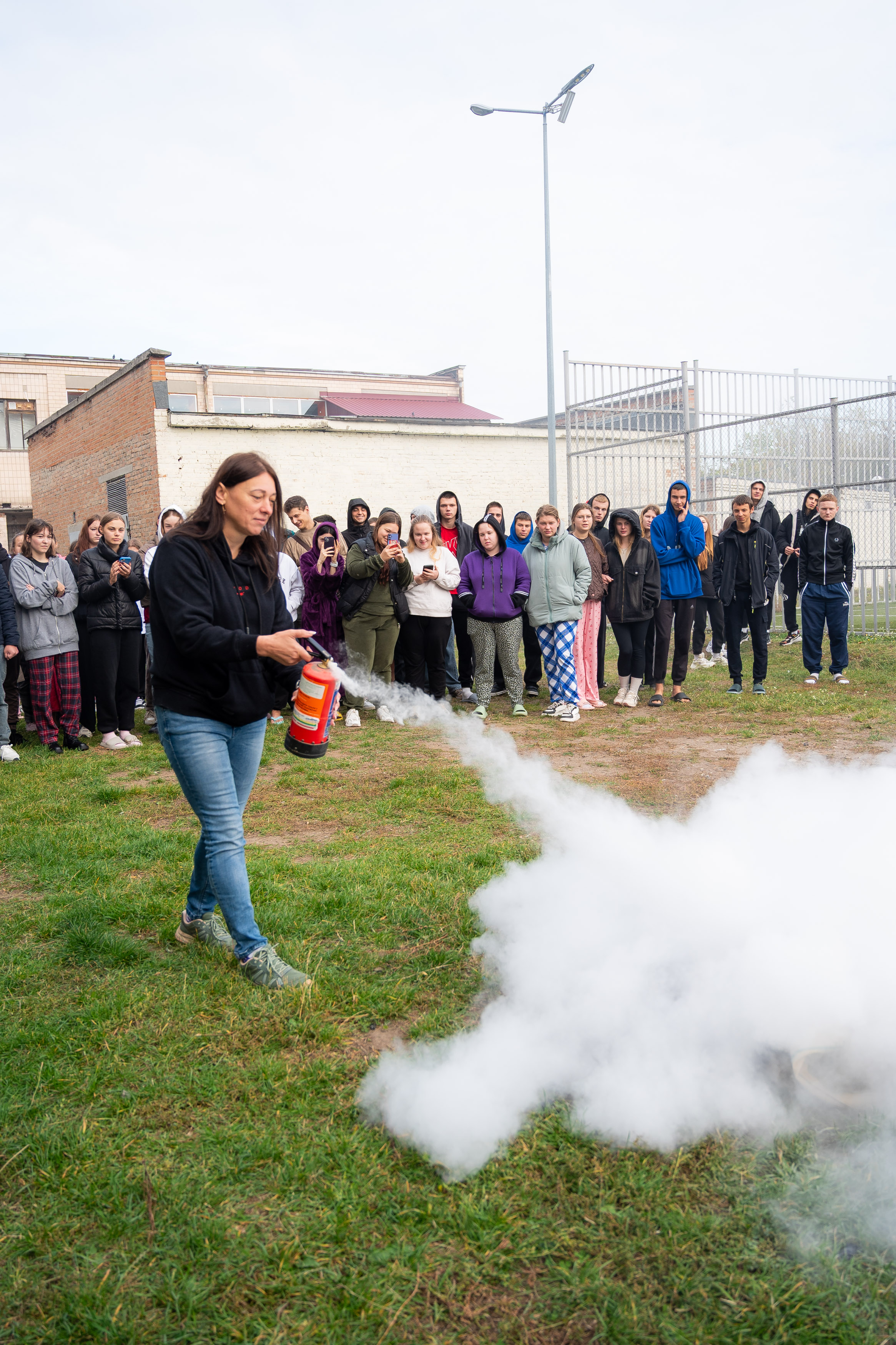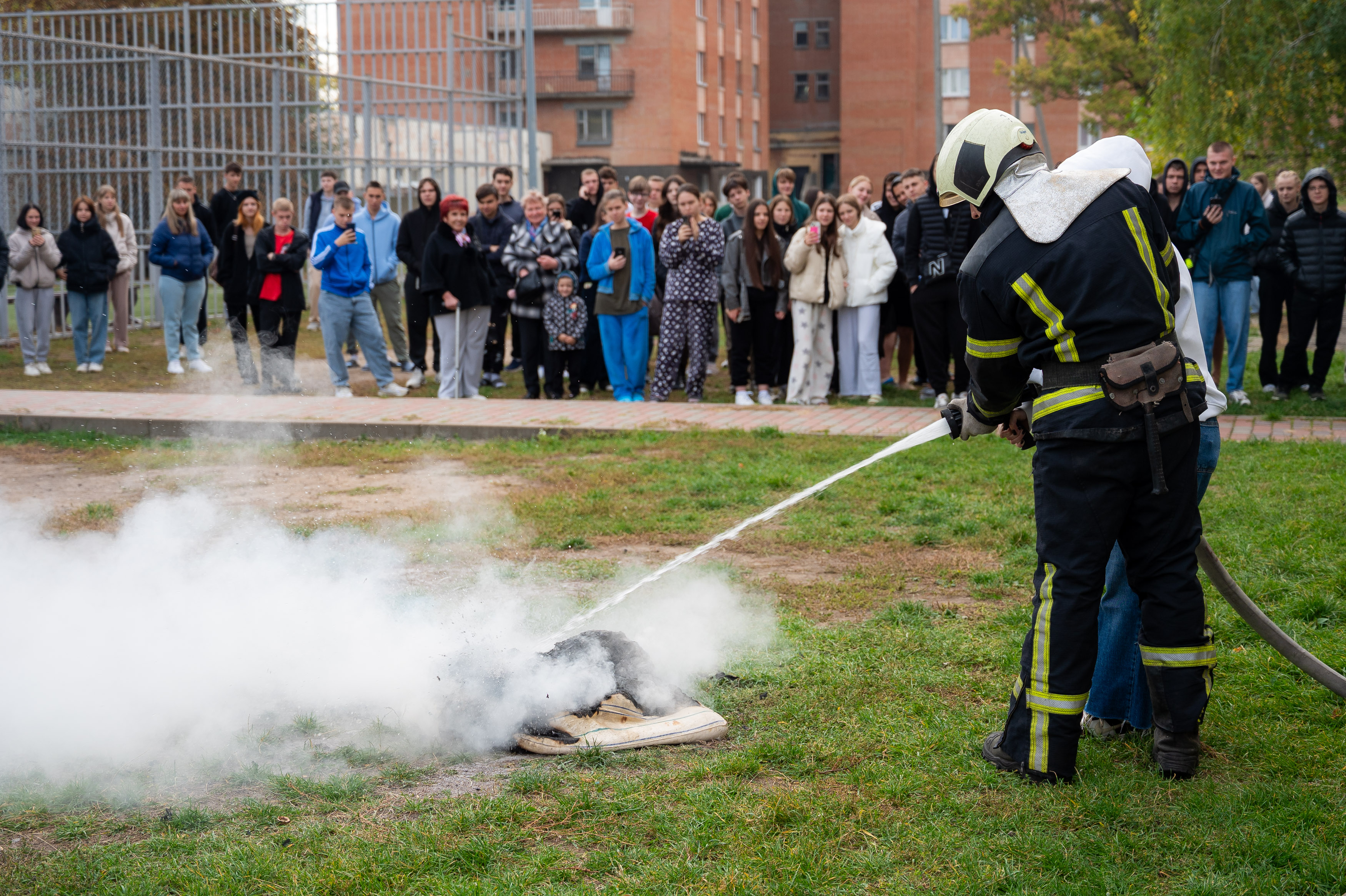 Завершальним етапом тренувань стало практичне відпрацювання навичок користування первинними засобами пожежогасіння. Працівники університету, персонал гуртожитків і студенти мали змогу під керівництвом рятувальників відточити вміння правильно та безпечно користуватися вогнегасником.