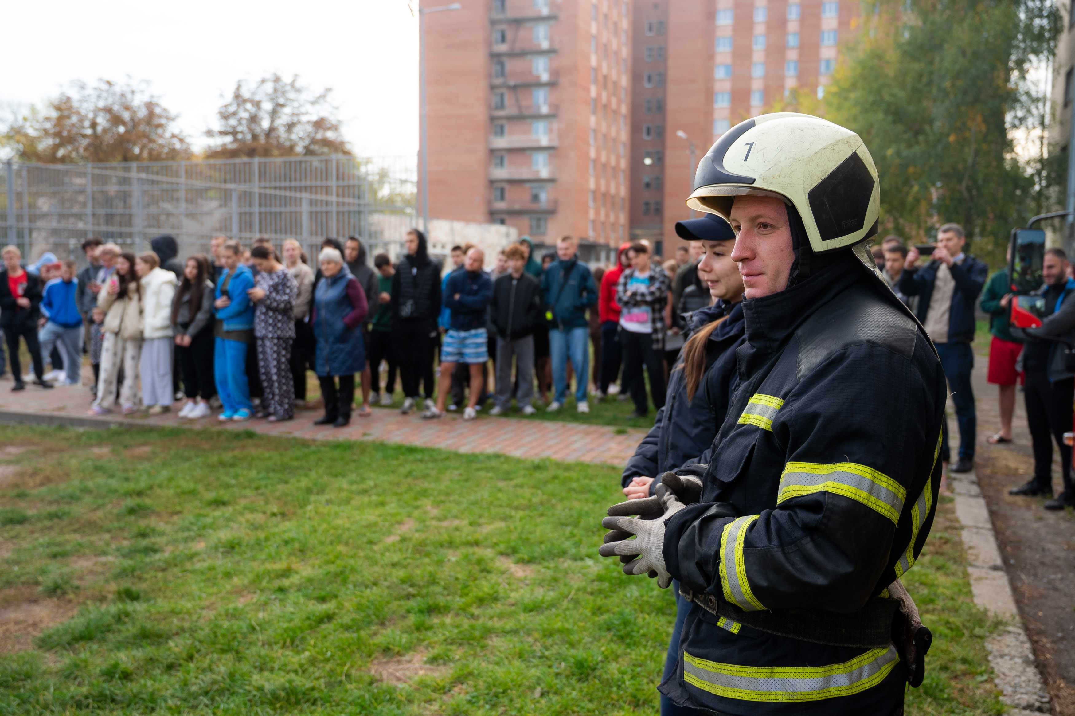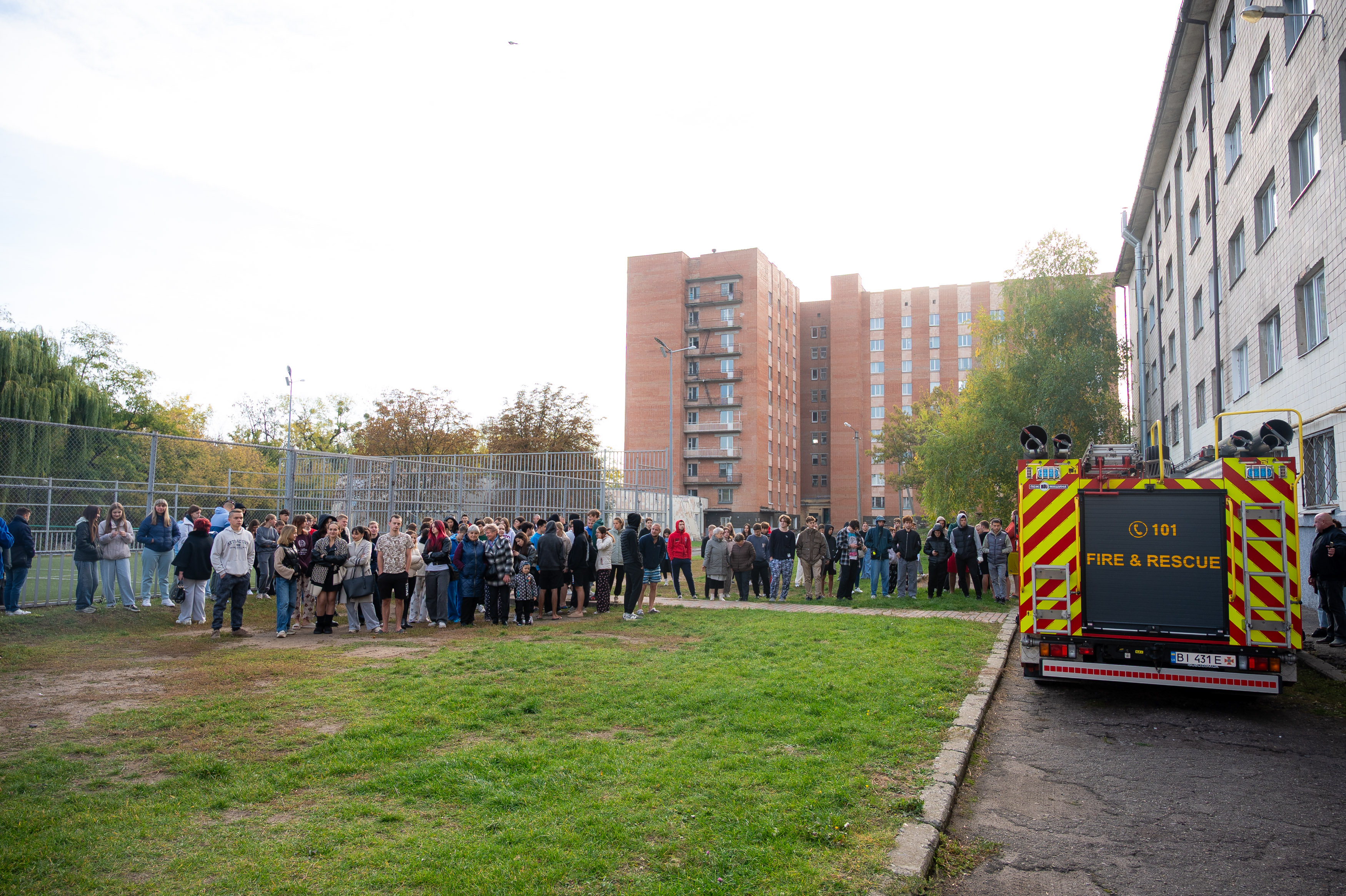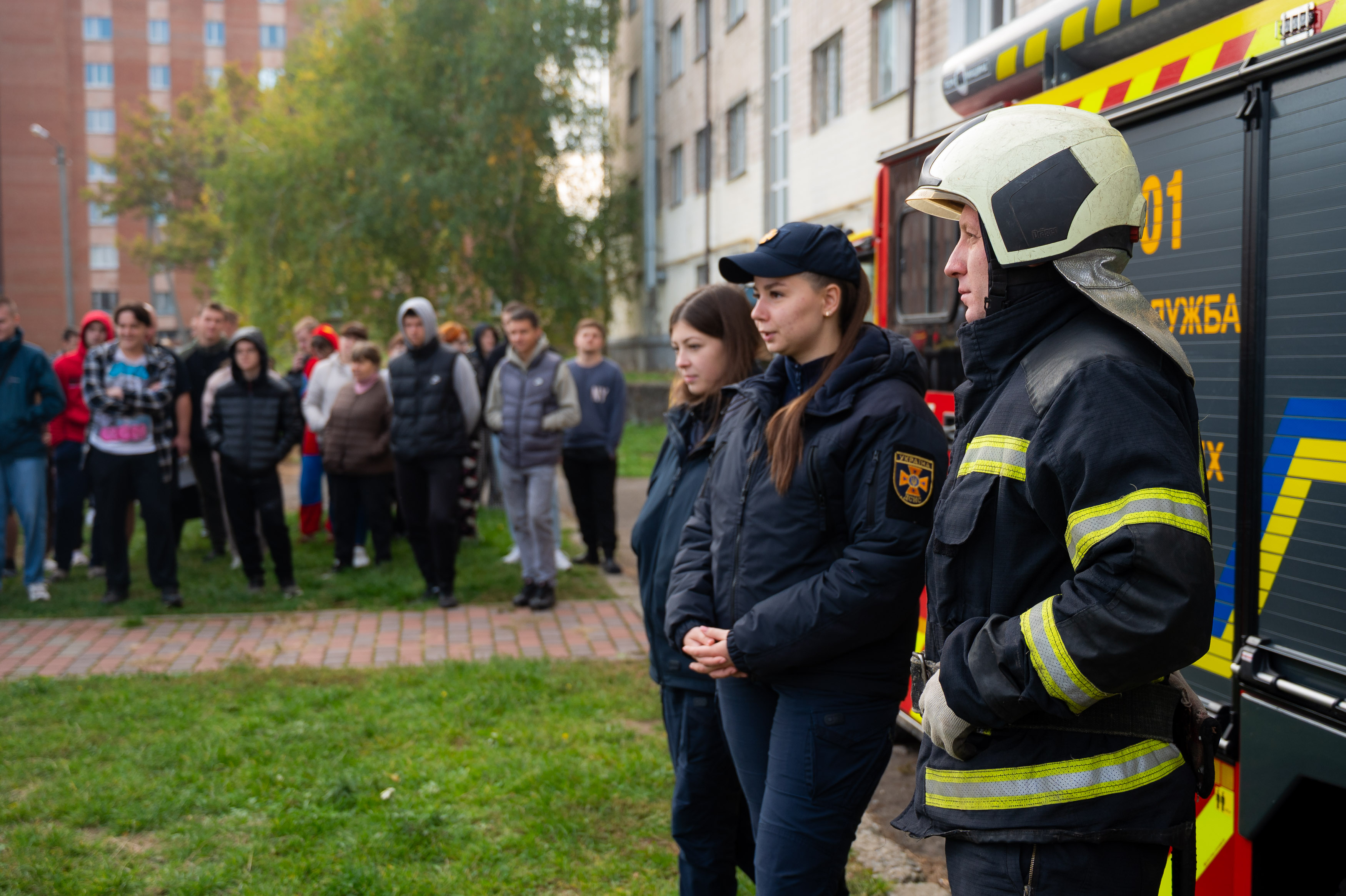Під час тренування рятувальники спільно з мешканцями гуртожитків відпрацювали алгоритм дій після сигналу «Увага всім! Повітряна тривога», актуалізували знання щодо правил поведінки під час перебування в укриттях при виникненні надзвичайних ситуацій.