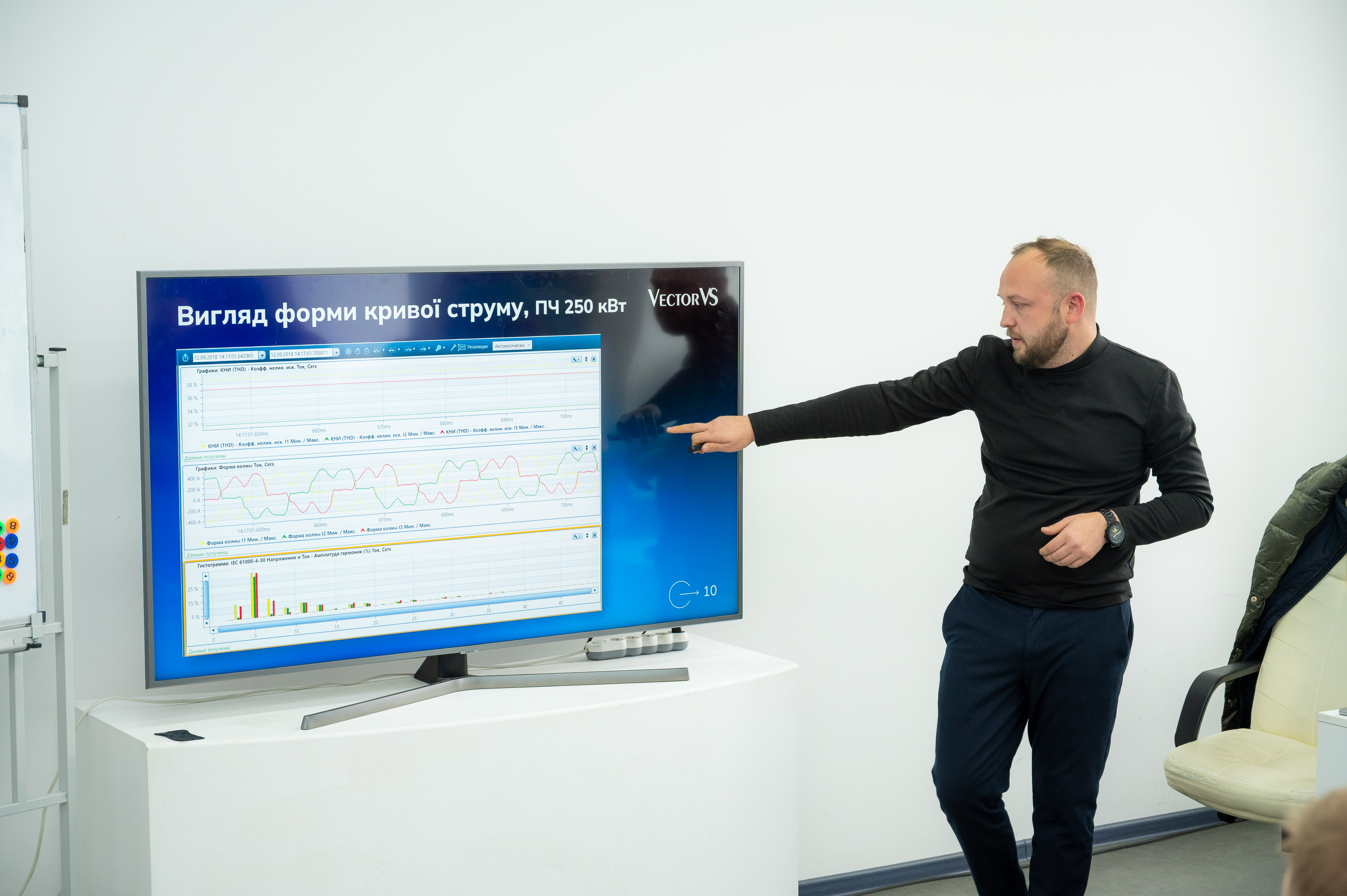 Під час воркшопу учасники розглянули реальні кейси з практики VektorVS, дізналися про вплив вищих гармонік на роботу електрообладнання, методи діагностики та компенсації спотворень, а також обговорили виклики, пов’язані з переходом на сучасні енергоефективні технології.