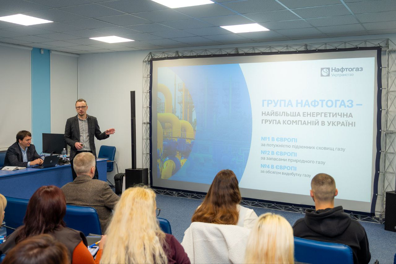 Максим Білоус, керівник групи добору, залучення та розвитку талантів, розпочав курс стажування, презентуючи структуру компанії та унікальні можливості, які АТ «Укртрансгаз» створює для майбутніх фахівців через студентські дослідження та дуальну освіту. Такий формат співпраці сприяє формуванню сучасних компетентностей і підготовці фахівців, здатних ефективно працювати в енергетичній галузі України.