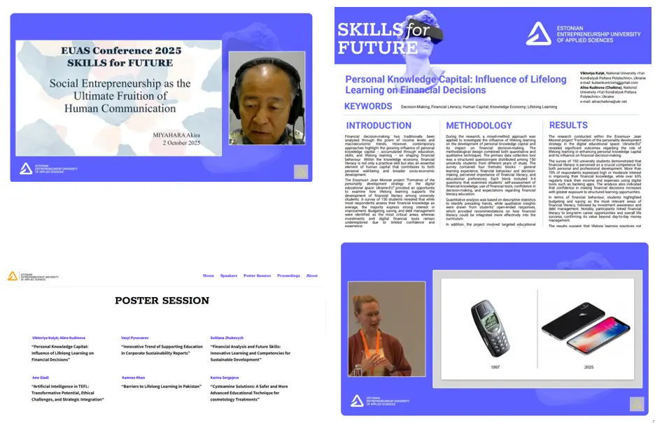 Наш університет був представлений у постерній сесії конференції. Професор Вікторія КУЛИК та доцент Аліна КУДІНОВА презентували дослідження «Personal Knowledge Capital: Influence of Lifelong Learning on Financial Decisions» («Персональний капітал знань: вплив неперервного навчання на фінансові рішення»). Робота виконана в межах проєкту модуля Жана Моне програми Erasmus+ «Формування стратегії розвитку особистості в цифровому освітньому просторі: Україна–ЄС» (Грант № 101127592 — FPDSDESUEU).