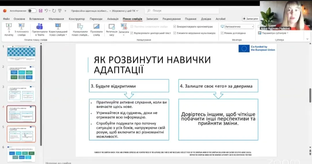 Аліна КУДІНОВА (ЧАЙКІНА) представила доповідь на тему: «Особливості професійної адаптації особистості: схильності та стратегії», підготовлену у межах реалізації проєкту Erasmus+ Jean Monnet «Formation of the personality development strategy in the digital educational space: Ukraine-EU» (проєкт №101127592 – FPDSDESUEU). Кожен спікер отримав сертифікат, що є підтвердженням високого наукового рівня учасників та активної позиції у розвитку української науки.
