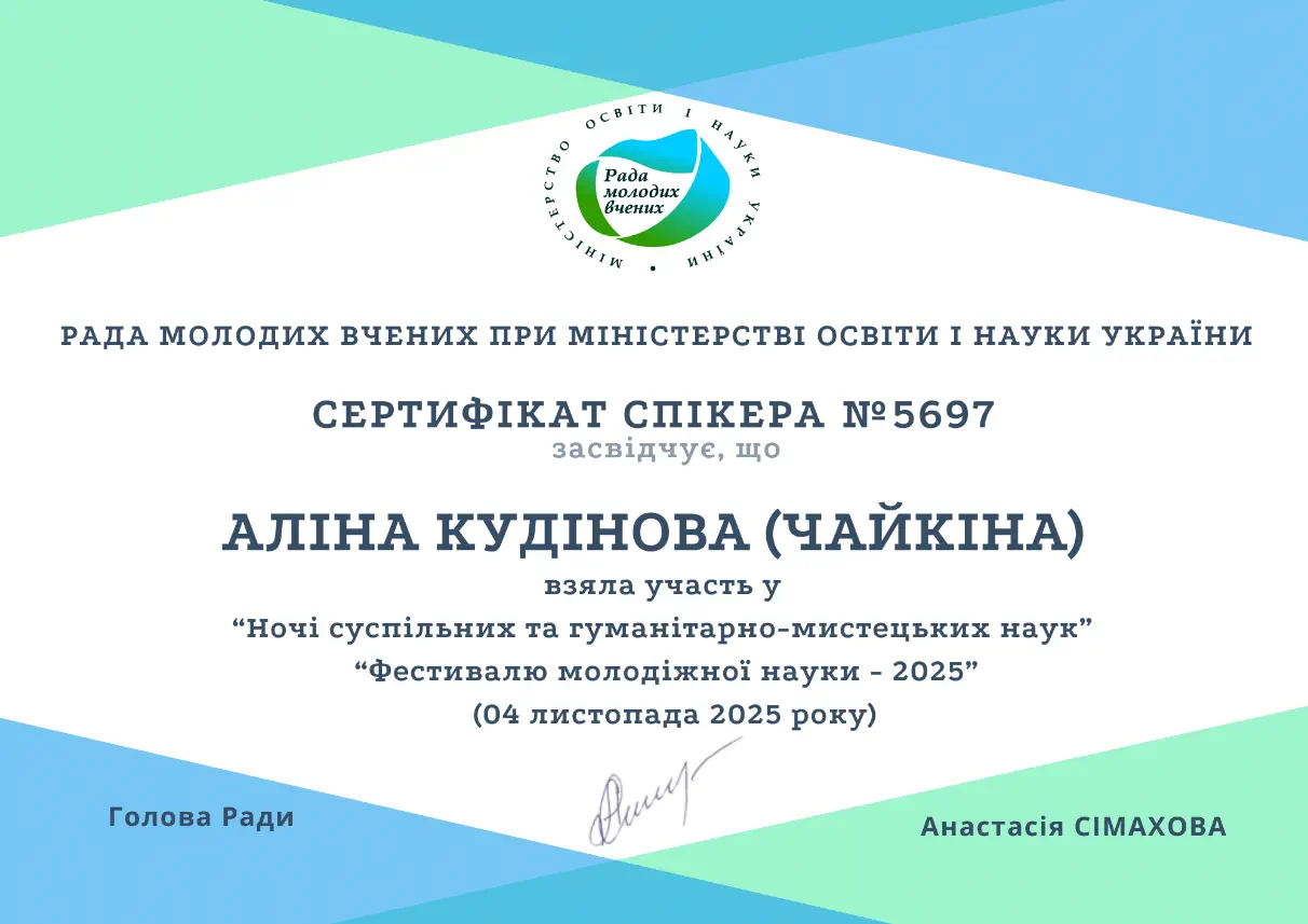 К.е.н., доцент, доцент кафедри менеджменту і логістики Національного університету «Полтавська політехніка імені Юрія Кондратюка» Аліна КУДІНОВА (ЧАЙКІНА) стала Спікером на знаковій події – «Ночі суспільних та гуманітарно-мистецьких наук» в рамках «Фестивалю молодіжної науки – 2025», що відбулася 04 листопада 2025 року в онлайн-форматі. Цей захід, організований Радою молодих вчених при Міністерстві освіти і науки України, є справжньою платформою для обміну знаннями та натхненням між молодими науковцями.