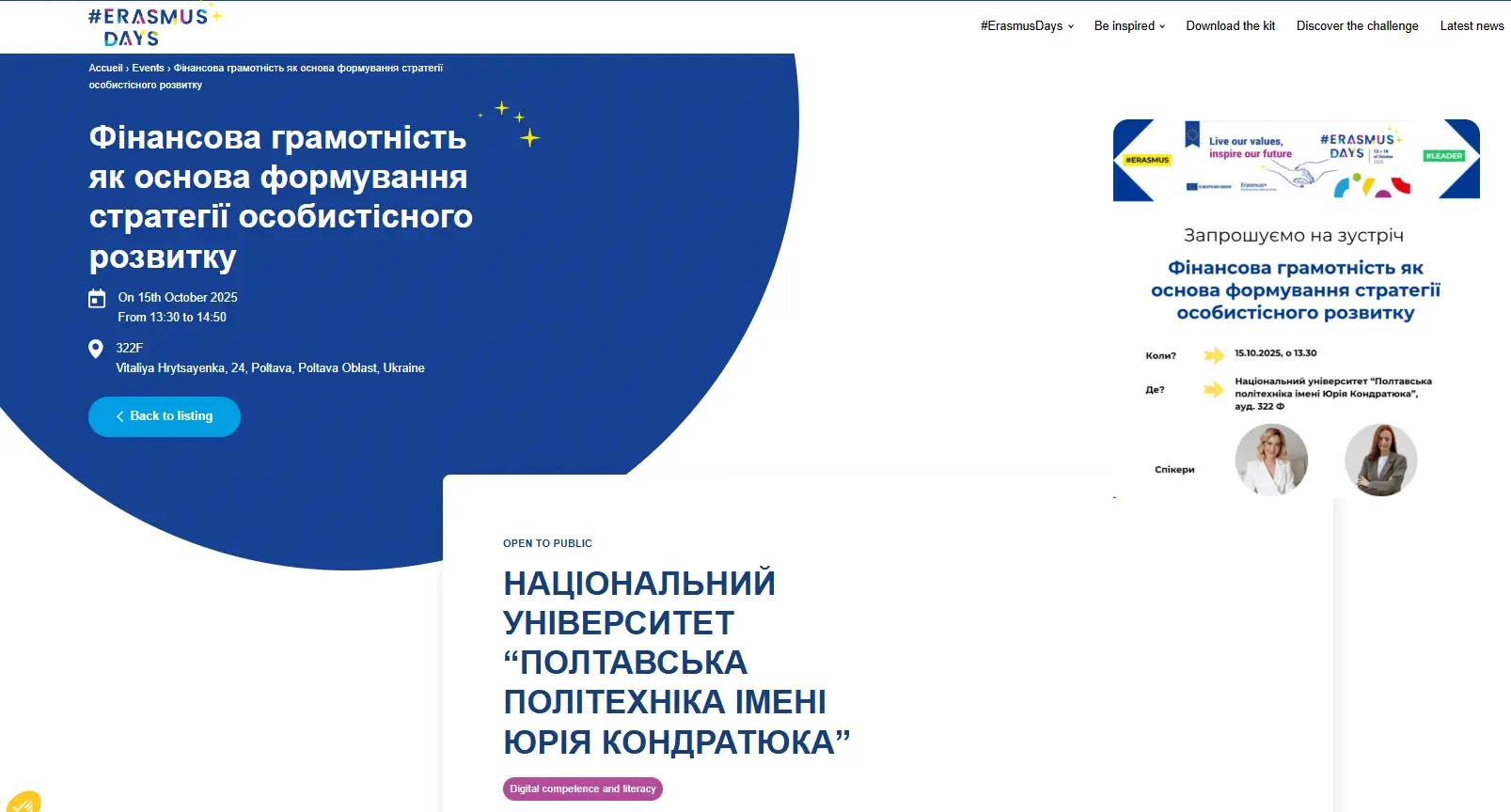15 жовтня 2025 року, у рамках заходів #ErasmusDays, які щороку відзначаються у всьому світі в жовтні, команда проєкту Erasmus+ Жан Моне «Formation of the personality development strategy in the digital educational space: Ukraine–EU» (№ 101127592 – FPDSDESUEU) провела семінар-тренінг на тему «Фінансова грамотність як основа формування стратегії особистісного розвитку».