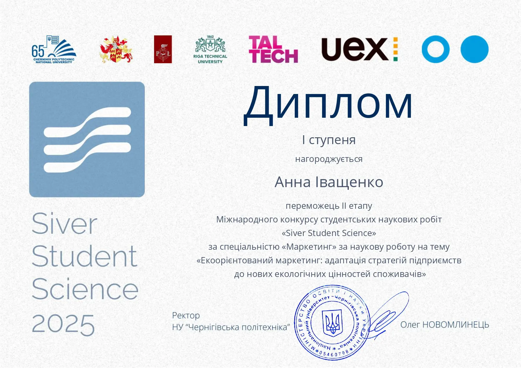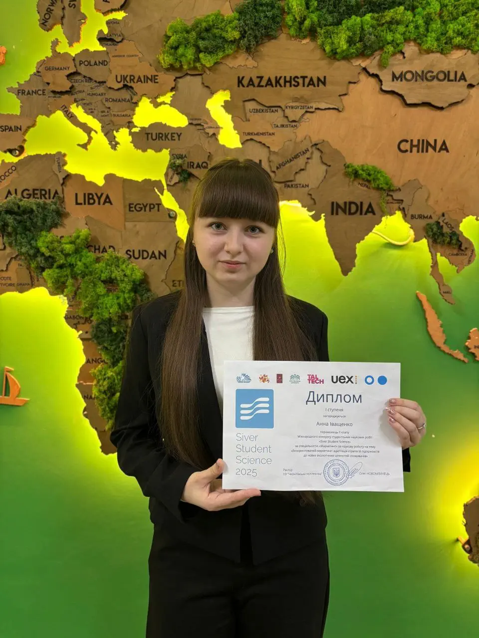 Студентка другого курсу Навчально-наукового інституту фінансів, економіки, управління та права Анна Іващенко здобула диплом переможця ІІ етапу Міжнародного конкурсу студентських наукових робіт «Siver Student Science» за спеціальністю «Маркетинг».