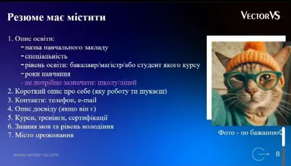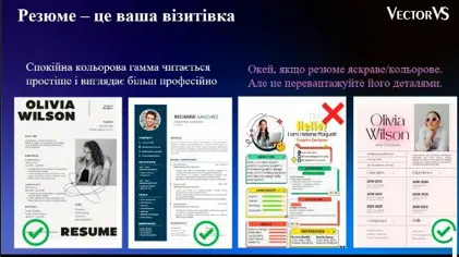 Особливу увагу спікер Надія ДЕНИСЕНКО – директорка з управління персоналом у ТОВ «ТВК Вектор-ВС» (Vector VS) приділила розбору типових помилок, які заважають кандидатам отримати бажаний оффер. Студенти на практиці вчилися структурувати свій досвід та виділяти ключові компетенції, що цікавлять рекрутерів. Завдяки інтерактивному формату кожен зміг отримати фахові поради щодо покращення власного CV.