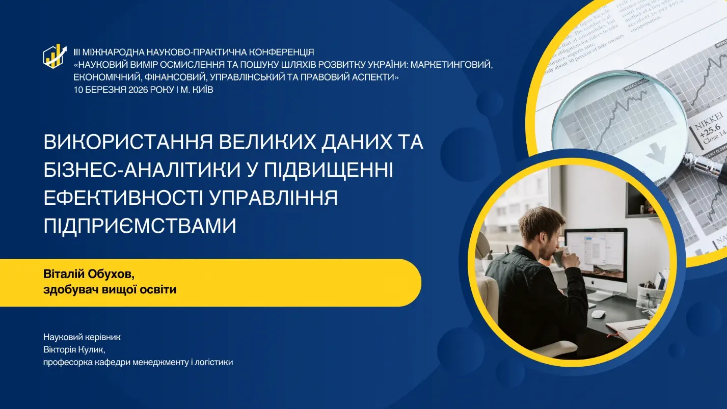 Здобувач вищої освіти Віталій ОБУХОВ презентував результати дослідження на тему «Використання великих даних та бізнес-аналітики у підвищенні ефективності управління підприємствами» (науковий керівник ‒ професорка Вікторія КУЛИК). У доповіді було розглянуто роль інструментів аналізу великих даних та бізнес-аналітики у формуванні інформаційної бази для прийняття стратегічних і тактичних управлінських рішень.