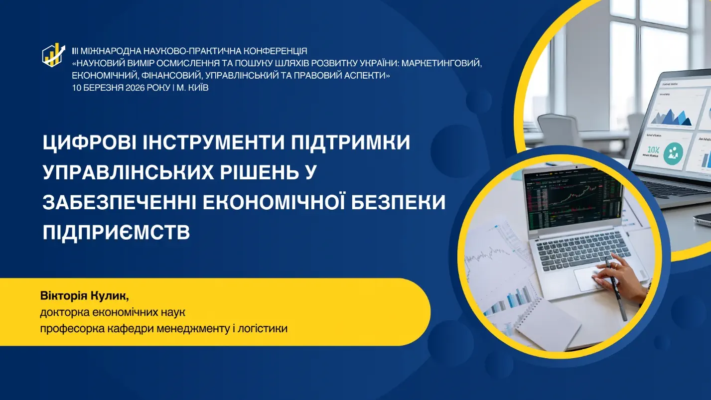 Зокрема, професорка кафедри менеджменту і логістики Вікторія КУЛИК представила доповідь на тему «Цифрові інструменти підтримки управлінських рішень у забезпеченні економічної безпеки підприємств», у якій було висвітлено можливості використання сучасних цифрових технологій для підвищення обґрунтованості управлінських рішень та зміцнення економічної безпеки підприємств в умовах цифрової трансформації.