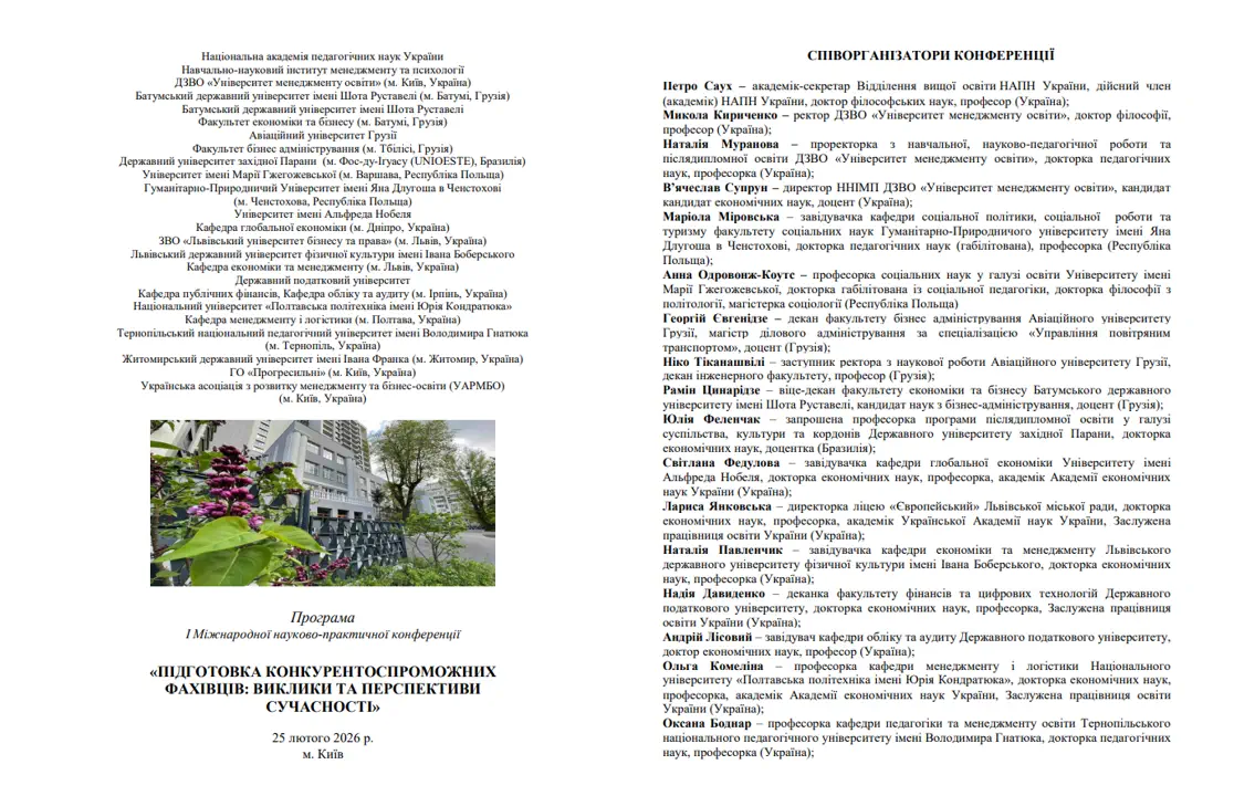 25 лютого 2026 року на базі ДЗВО «Університет менеджменту освіти» НАПН України відбулася І Міжнародна науково-практична конференція «Підготовка конкурентоспроможних фахівців: виклики та перспективи сучасності». Захід об’єднав наукову спільноту України, Республіки Польщі, Грузії, Бразилії та Словаччини.