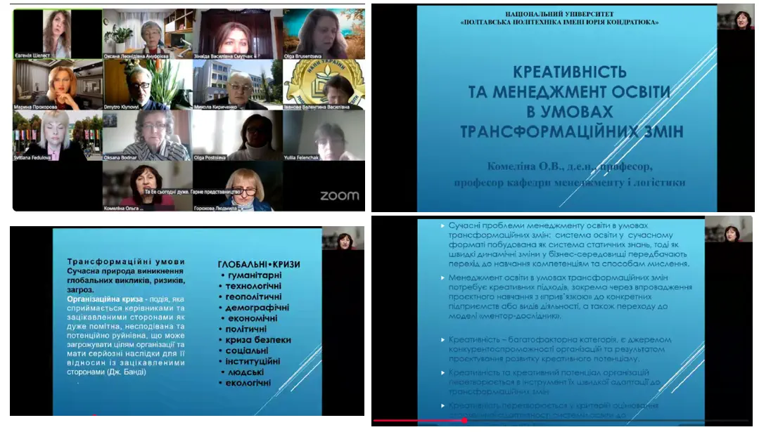 22 травня 2025 року викладачі кафедри менеджменту і логістики Національного університету «Полтавська політехніка імені Юрія Кондратюка» професор, д.е.н. Вікторія КУЛИК, доценти, к.е.н. Аліна КУДІНОВА, Віктор ГРИШКО, доцент, к.т.н. Людмила ГУБА, асистент Інга КАНДЗЮБА взяли участь у ХVІІІ Всеукраїнському круглому столі «Якість підготовки менеджерів: принципи, технології, перспективи», що відбувся за ініціативи кафедри менеджменту Державного торговельно-економічного університету у форматі Zoom-конференція.