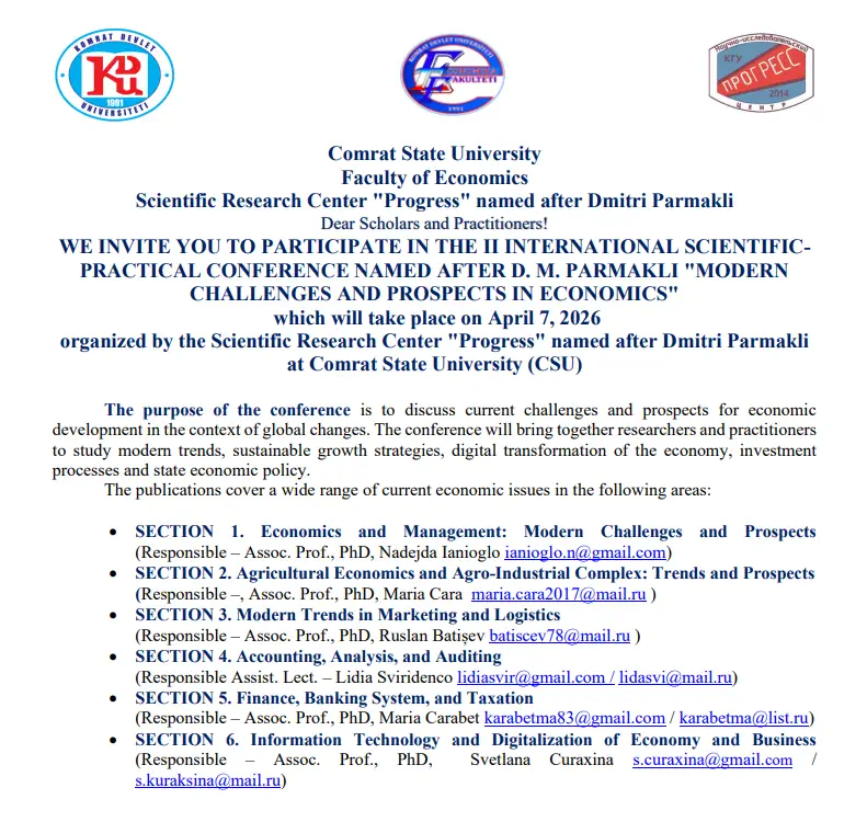 7 квітня 2026 року на базі Комратського державного університету (Республіка Молдова) відбулася ІІ Міжнародна науково-практична конференція імені Д. М. Пармаклі «Modern Challenges and Prospects in Economics», присвячена актуальним викликам і перспективам розвитку економіки в умовах глобальних трансформацій.