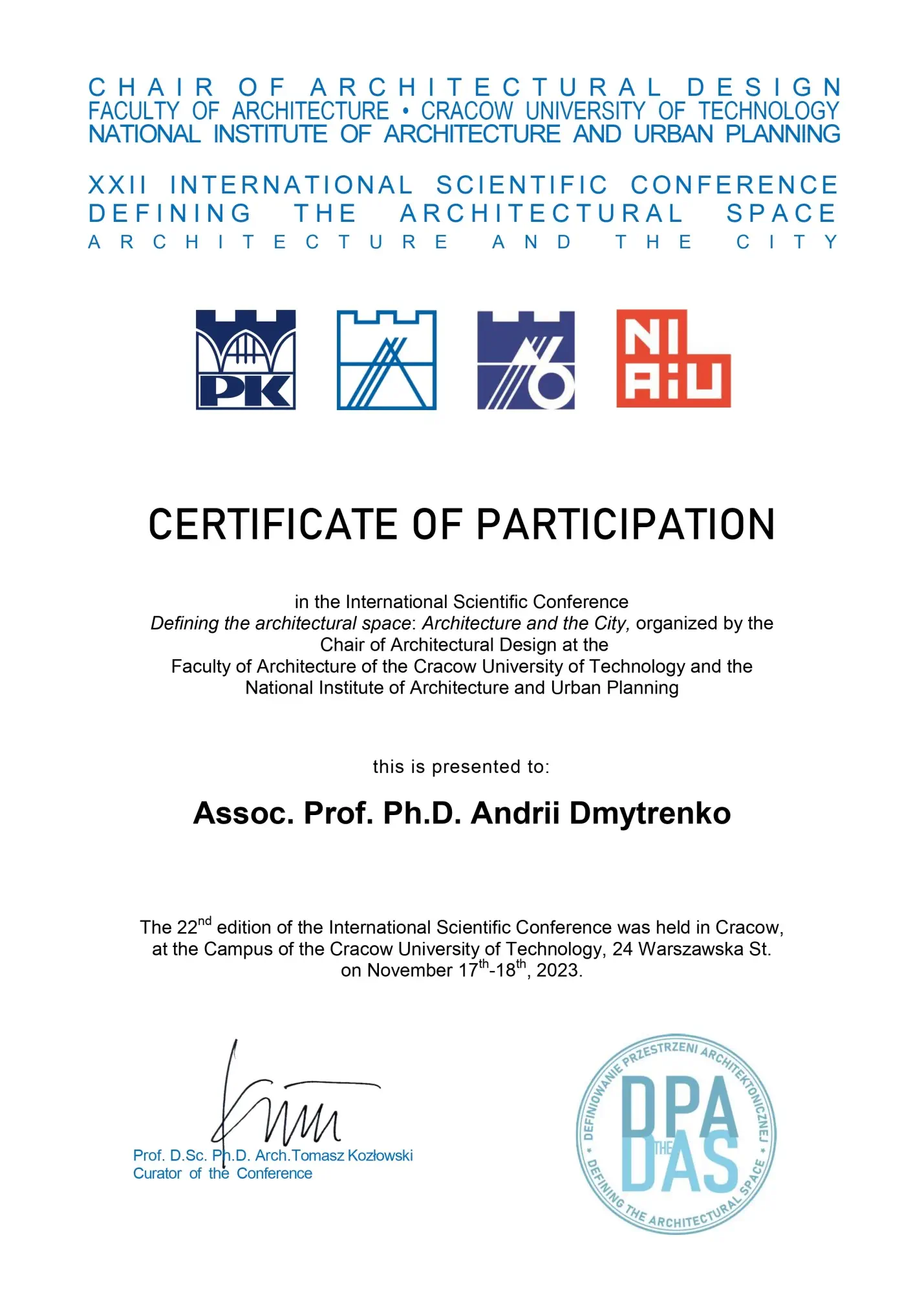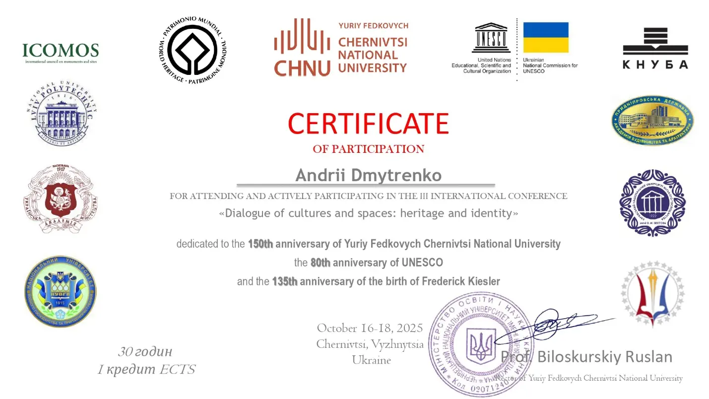 З 16 по 18 жовтня 2025 року доцент кафедри архітектури будівель та дизайну А.Ю. Дмитренко узяв участь (у дистанційній формі) у ІІІ Міжнародній науково-практичній конференції «Діалог культур і просторів: спадщина та ідентичність» присвяченої 150-річчю Чернівецького національного університету імені Юрія Федьковича, 80-річчю ЮНЕСКО та 130-річчю від дня народження Фрідріха Кізлєра.