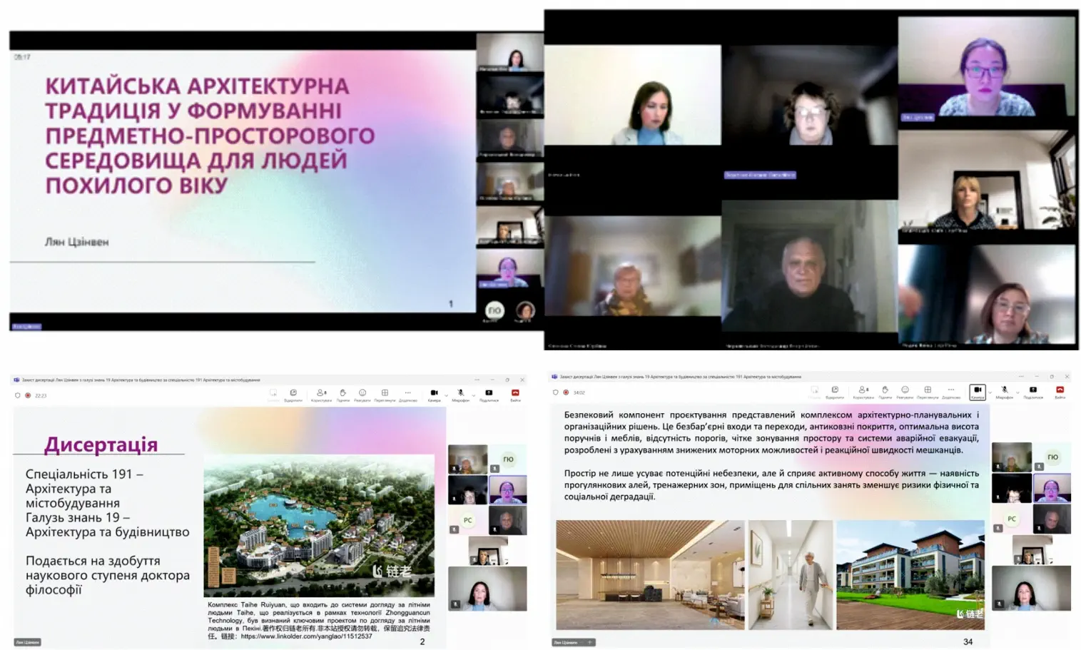 28 жовтня 2025 року кандидатка архітектури, доцентка кафедри Наталія НОВОСЕЛЬЧУК взяла участь у роботі разової спеціалізованої вченої ради Харківського національного університету міського господарства імені О.М. Бекетова у якості офіційного опонента дисертаційного дослідження Лян Цзінвен (КНР). Разова спеціалізована вчена рада затверджена наказом ХНУМГ ім. О.М. Бекетова від 04.09.2025 р. № 361-01 «Про створення разової спеціалізованої вченої ради з захисту дисертації на здобуття ступеня доктора філософії» та створена для захисту дисертації Лян Цзінвен на тему: «Китайська архітектурна традиція у формуванні предметно-просторового середовища для людей похилого віку» на здобуття ступеня доктора філософії за спеціальністю 191 «Архітектура та містобудування» з галузі знань 19 Архітектура та будівництво. Науковим керівником дослідження є доктор мистецтвознавства, професор Олена ОЛЕНІНА.