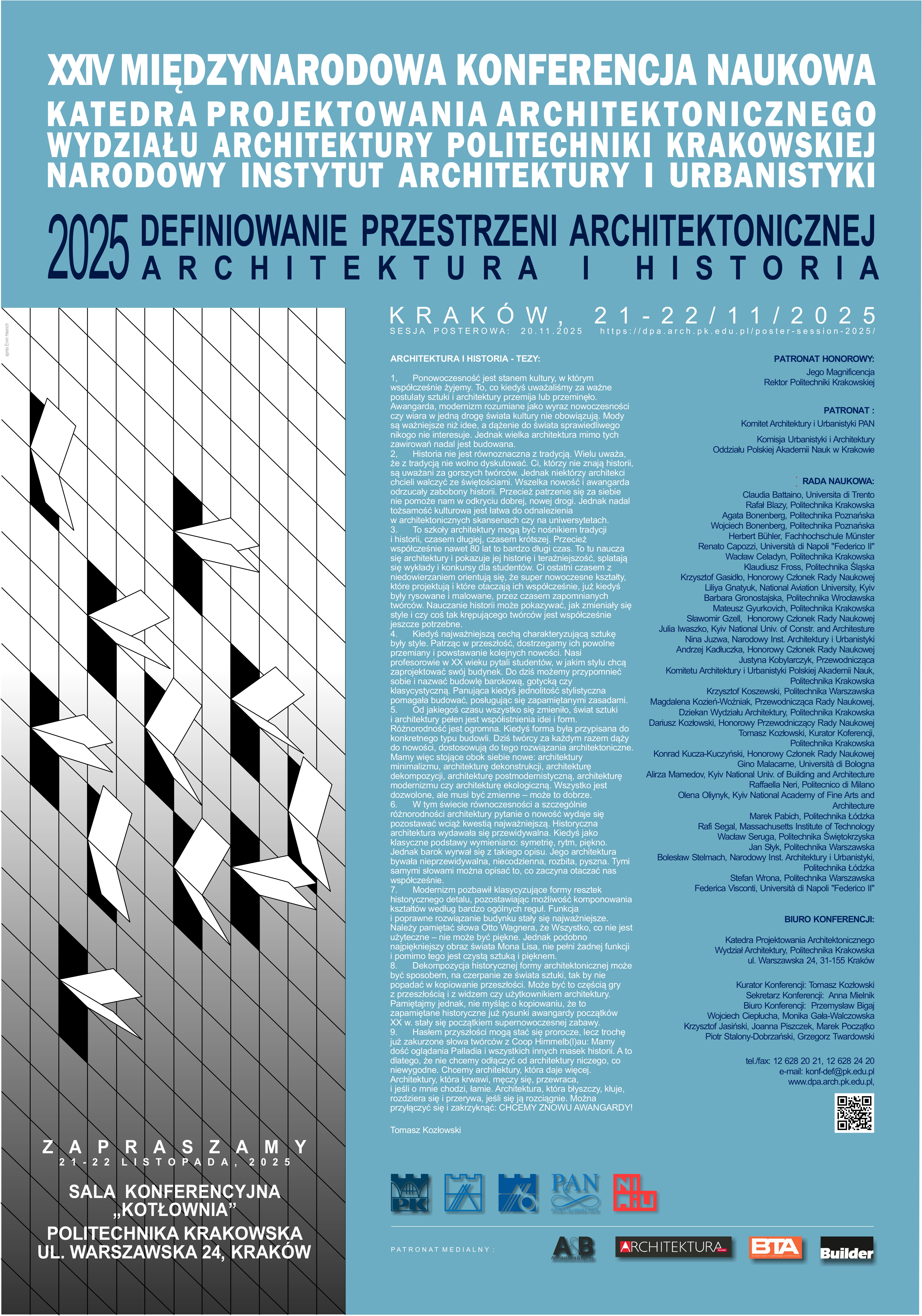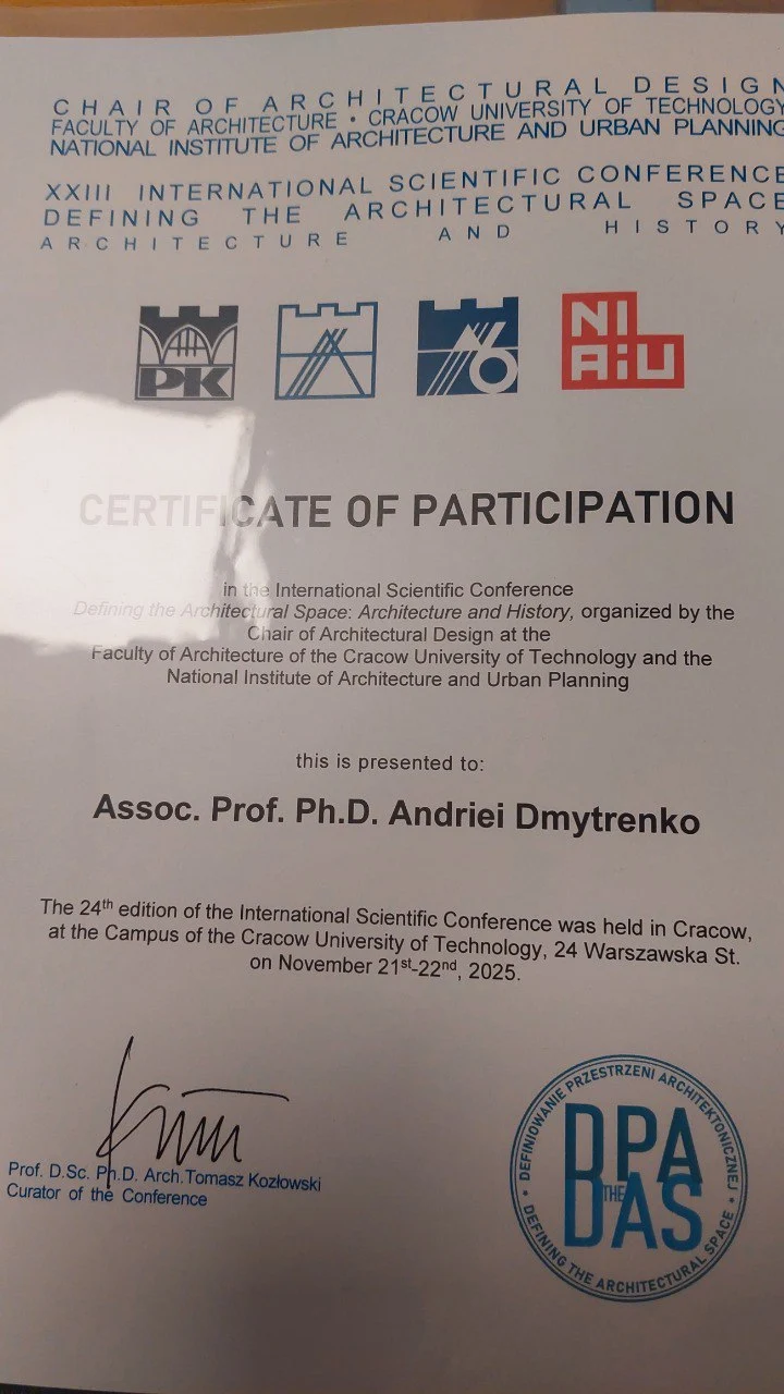 З 21 по 22 листопада 2025 року доцент кафедри архітектури будівель та дизайну Андрій Дмитренко узяв участь (дистанційно) у XXIV Міжнародній конференції “DEFINING THE ARCHITECTURAL SPACE – DEFINIOWANIE PRZESTRZENI ARCHITEKTONICZNEJ”, яка проходила у м. Краків, Польща, на базі Краківської політехніки імені Тадеуша Костюшко. З програмою конференції можна ознайомитися за посиланням https://dpa.arch.pk.edu.pl/schedule-2025/