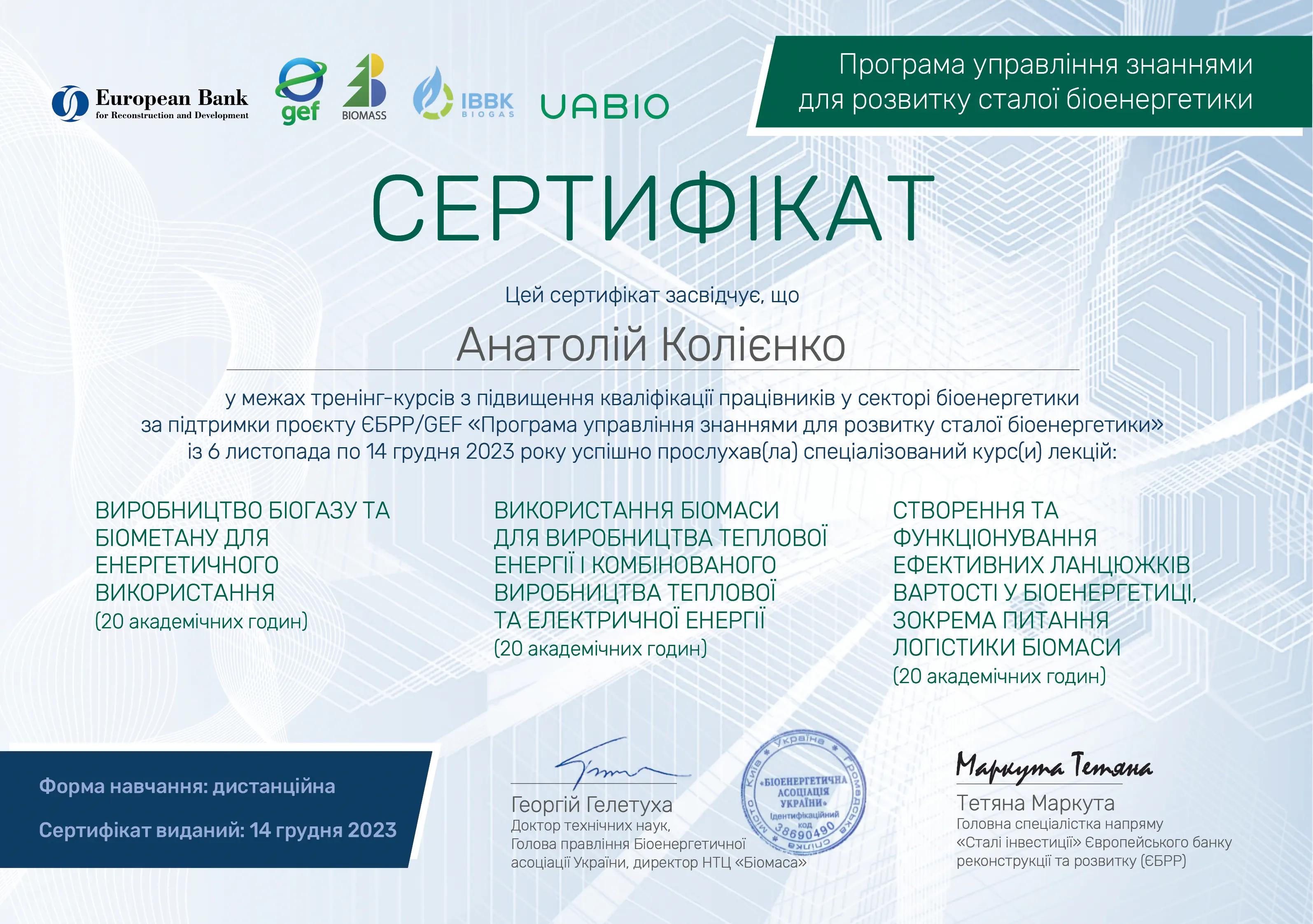 - UABIO, GEF, Біоенергетична асоціація України, курс: "Sustainable Bioenergy Value Chain Innovation- Knowlebge Management Programme" (Інноваційна програма сталого ланцюжка створення вартості біоенергетики- програма управління знаннями), сертифікат від 14.12.2023, 60 год