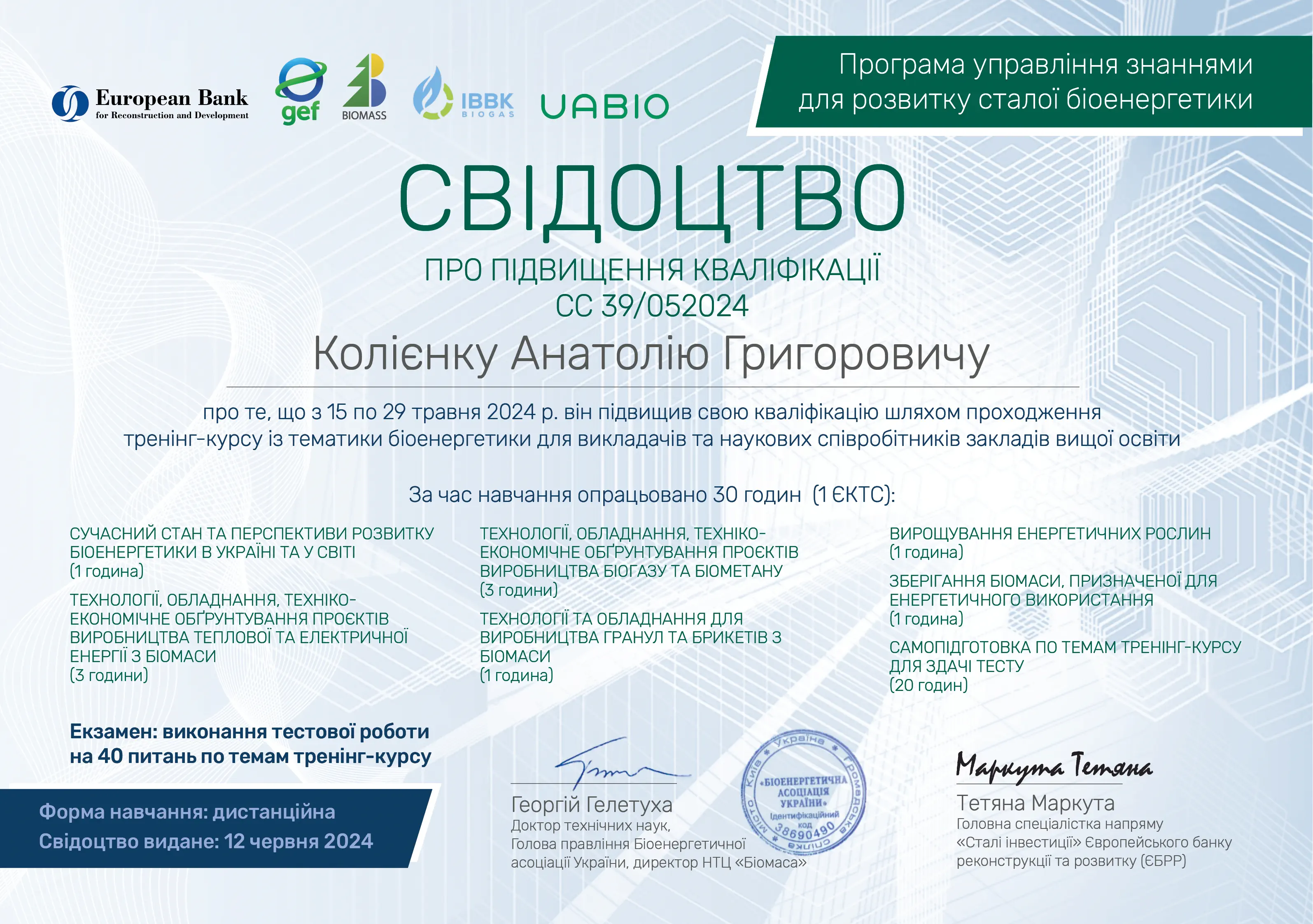 - UABIO, GEF, Біоенергетична асоціація України, програма управління знаннями для розвитку сталої біоенергетики, тренінг-курс із тематики біоенергетики для викладчів та наукових співробітників ЗВО, 15.05.24-29.05.24, свідоцтво СС 39/052024 від 12.06.2024, 30 год