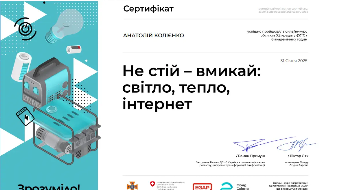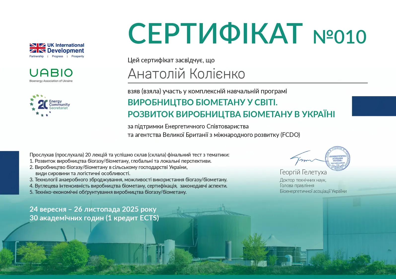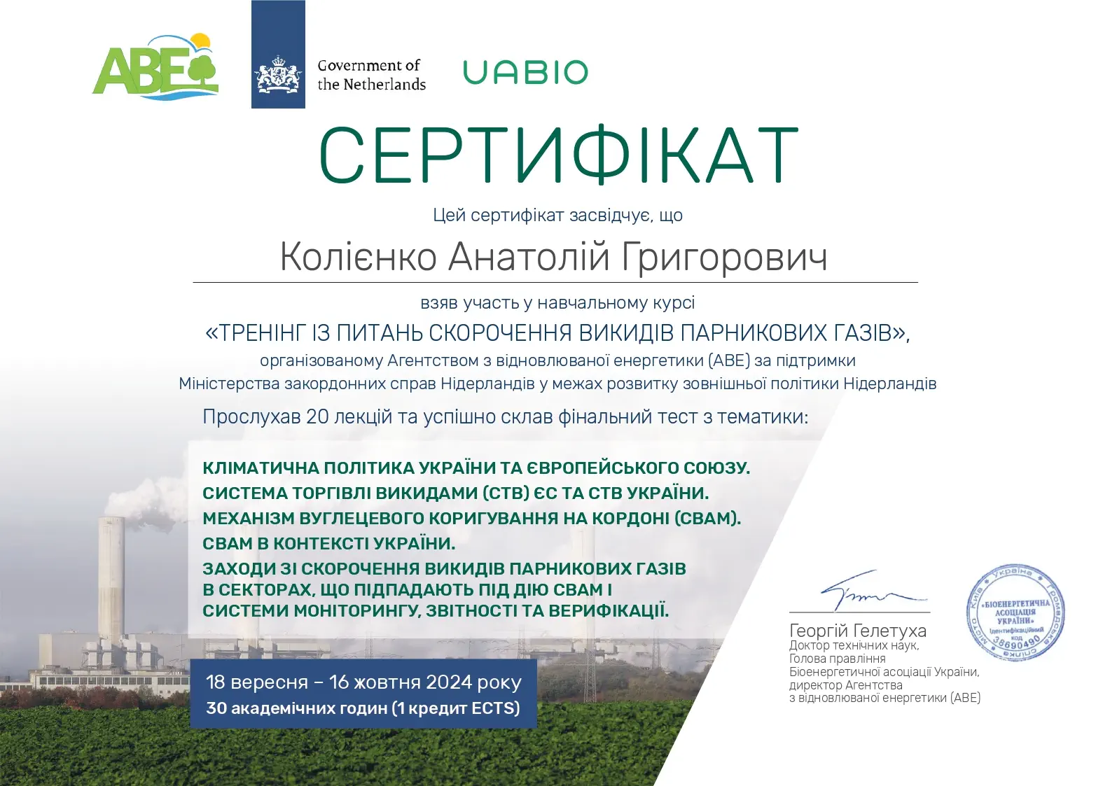 - UABIO, ГС "Біоенергетична асоціація України", курс "Тренінг із питань скорочення викидів парникових газів", 18.09.24-16.10.24, сертифікат, жовтень 2024, 30 год