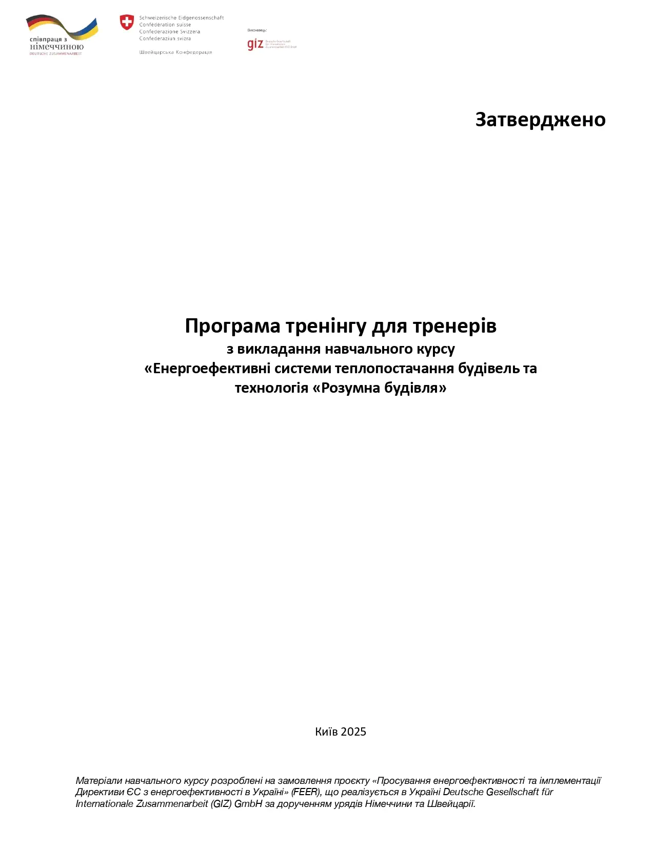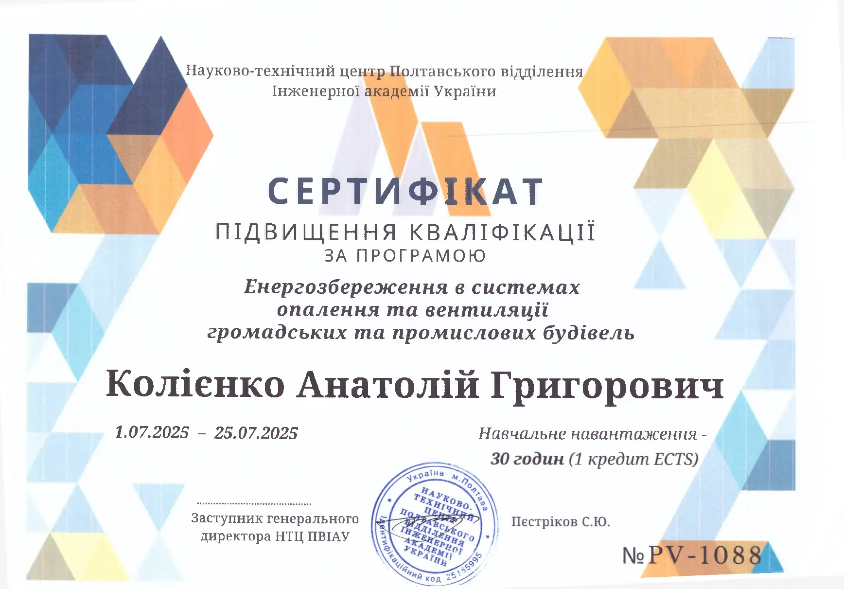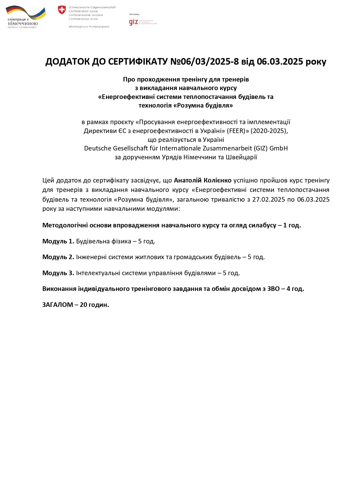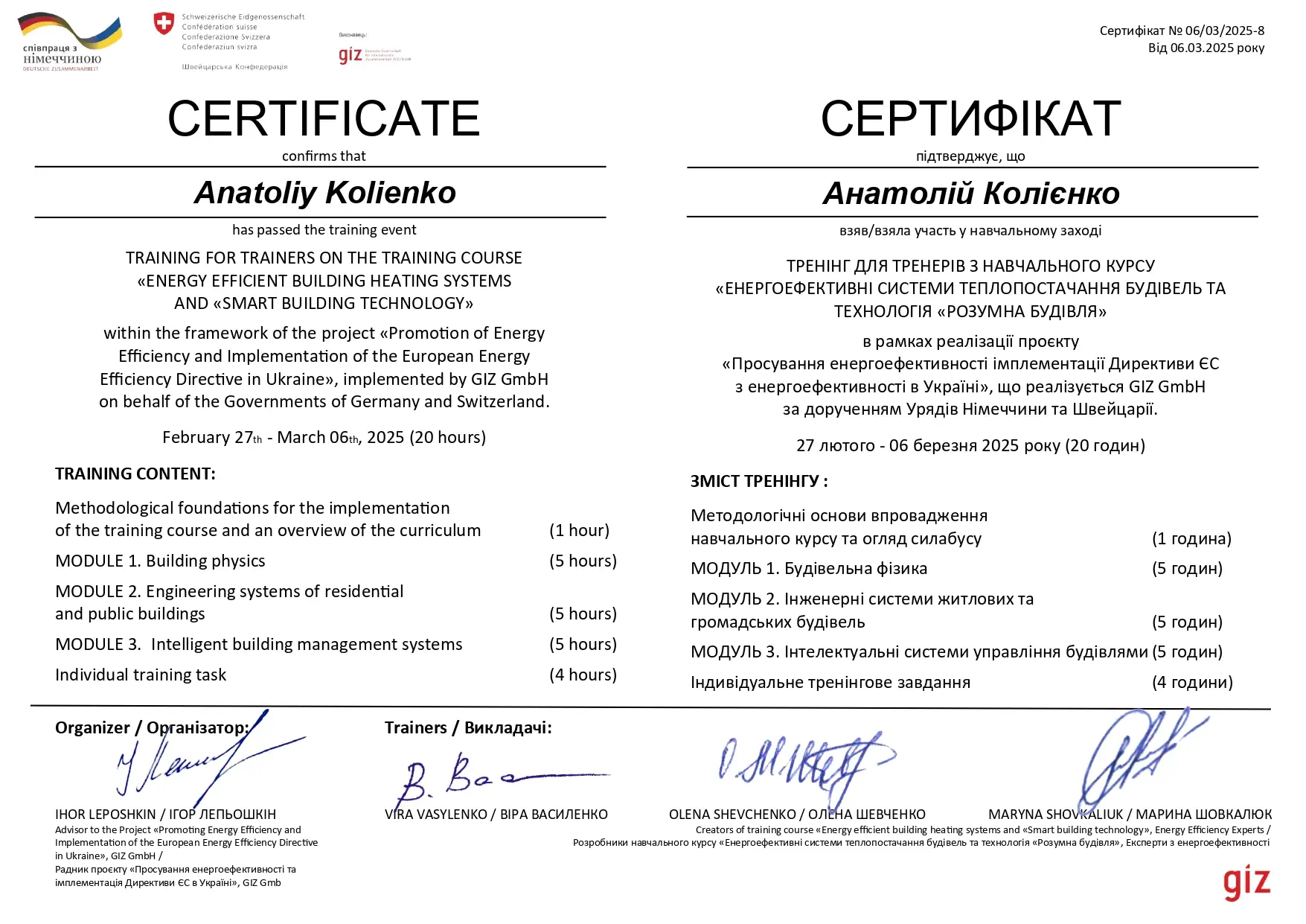- GIZ GmbH за дорученням Урядів Німеччини та Швейцарії, тренінг для тренерів з навчального курсу "Енергоефективні системи теплопостачання будівель та технологія "Розумна будівля", в рамках реалізації проєкту "Просування енергонерго-ефективності імплементації Директиви ЄС з енергоефективності в Україні", 27.02.2025-06.03.2025, сертифікат №06/03/2025-8 від 06.03.2025, 20 год.
