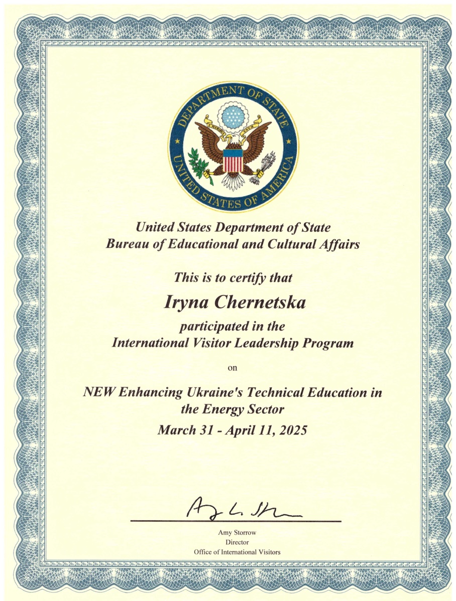 - United States Department of State, Bureau of Educational and Cultural Affairs, “International Visitor Leadership Program” on New Enhancing Ukraine’s Technical Education in the Energy Sector, March 31 – April 11, 2025