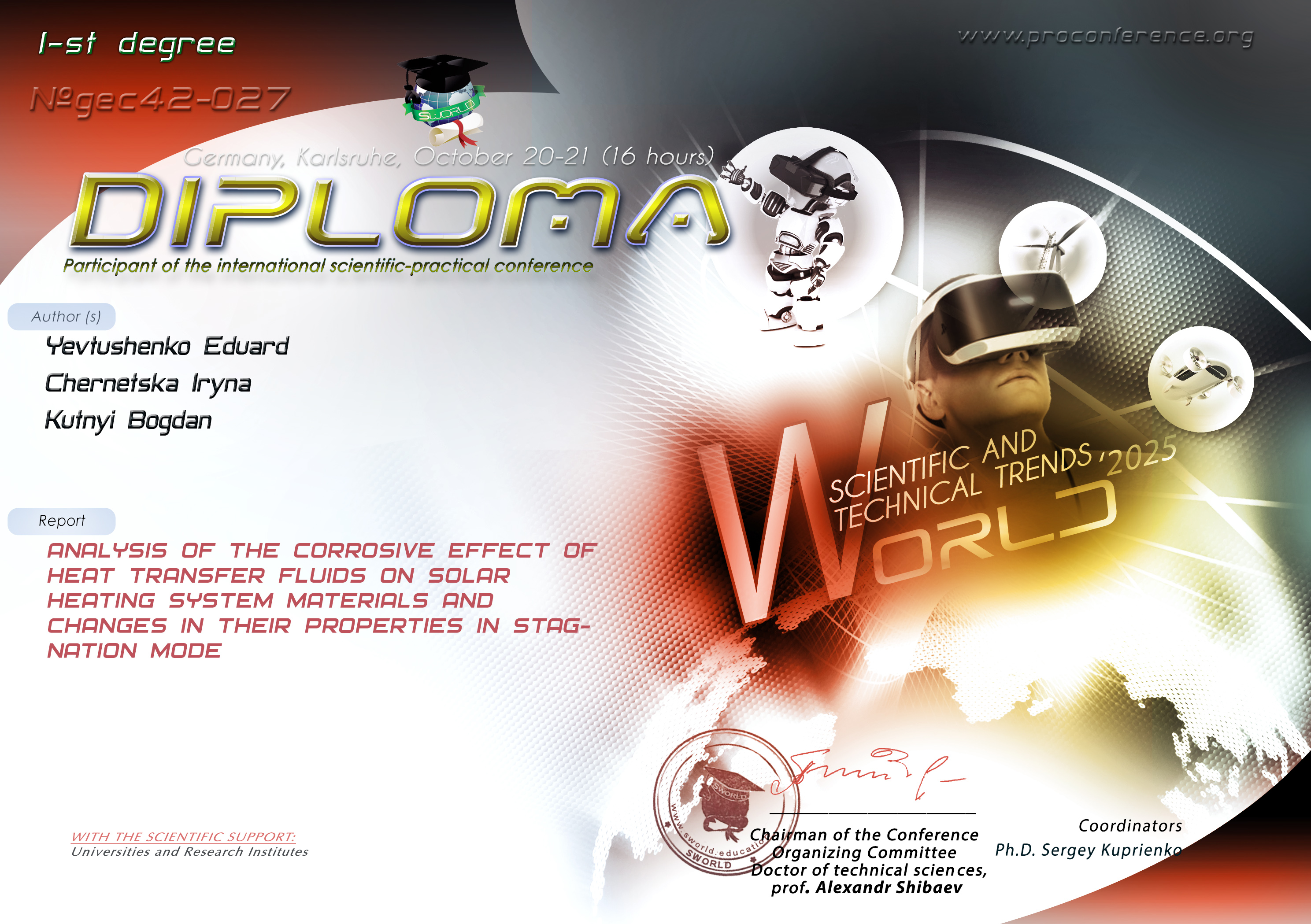 https://os4.nupp.edu.ua/admin/item/62613 - Yevtushenko E., Chernetska, I., Kutnyi, B. (2025). Analysis of the corrosive effect of heat transfer fluids on solar heating system materials and changes in their properties in stagnation mode. World scientific and technical trends, 1(26-01), 54–61. (Index Copernicus International)
