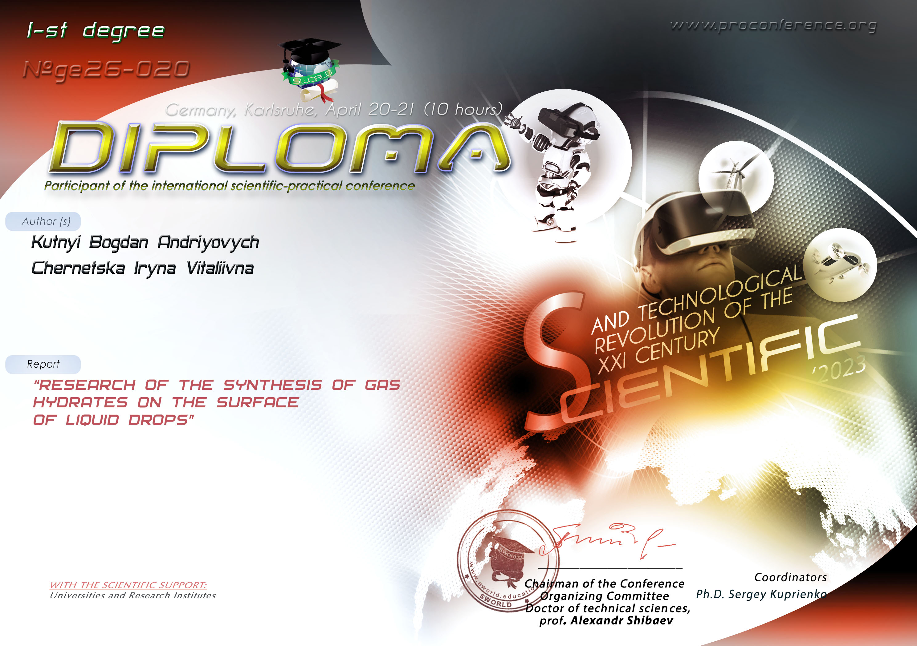 - Kutnyi B.A., Chernetska I.V. Research of the synthesis of gas hydrates on the surface of liquid drops / "Scientific and technological revolution of the XXI century '2023" Series «SW-Ger conference proceedings» No 26 on April 20, 2023. - p. 12-15. https://www.proconference.org/index.php/gec/article/view/gec26-01-020